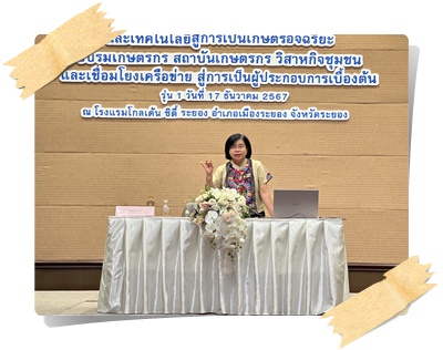 เมื่อวันที่ 17 ธันวาคม 2567 นางอุบล มากอง ผู้อำนวยการสำนักงานส่งเสริมและพัฒนาการเกษตรที่ 3 จังหวัดระยอง เป็นวิทยากรบรรยายให้ความรู้ เรื่อง การสร้างเครือข่ายเเละการบริหารจัดการองค์กรสู่การเป็นผู้ประกอบการเบื้องต้น รุ่นที่ 1 เเละ 2 ในโครงการพัฒนาด้านการเกษตรด้วยนวัตกรรมเเละเทคโนโลยี สู่การเป็นเกษตรอัจฉริยะ