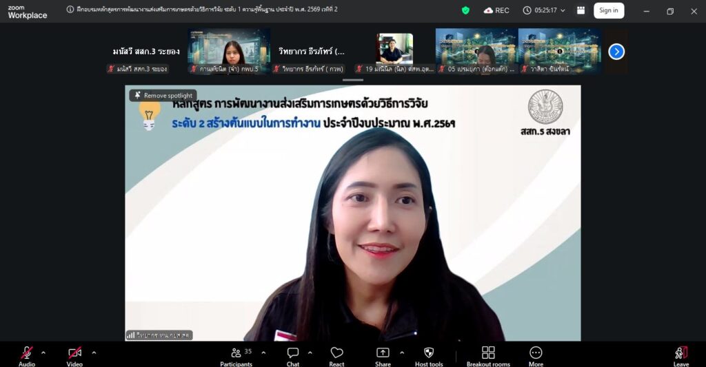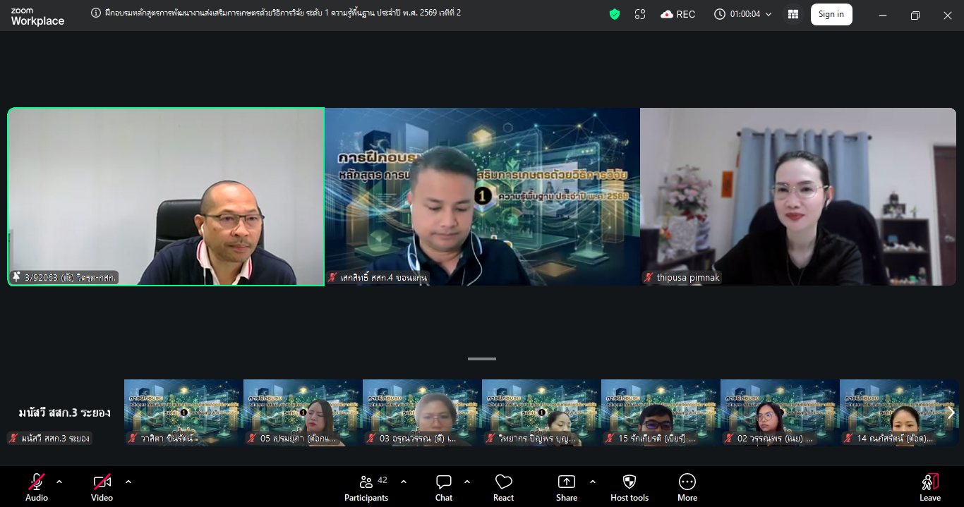 วันที่ 25 มีนาคม 2569 กลุ่มพัฒนาบุคลากร จัดประชุมหลักสูตร “การพัฒนางานส่งเสริมการเกษตรด้วยวิธีการวิจัย ระดับ 1 (ความรู้พื้นฐาน) เวทีที่ 2” ประจำปีงบประมาณ พ.ศ. 2569 ผ่านระบบออนไลน์ (Zoom Meeting) โดยมีทีมวิทยากร ผู้จัด และผู้เข้าร่วมอบรม รวมทั้งสิ้น 42 คน