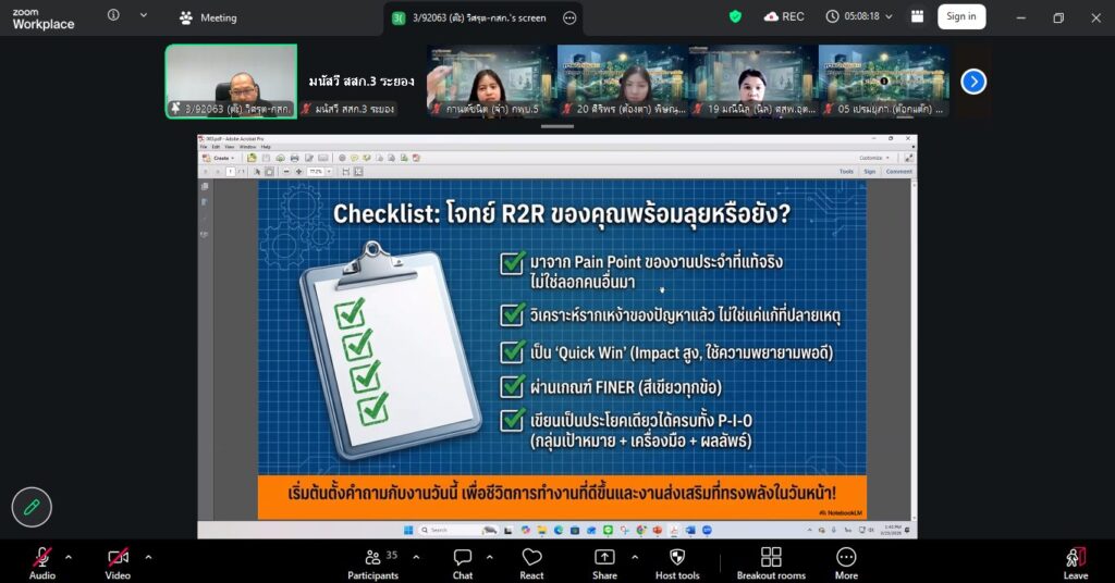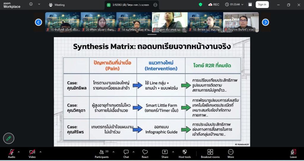 บรรยากาศการเรียนรู้เต็มไปด้วยความเข้มข้นและการมีส่วนร่วม ภายใต้หัวข้อสุดโดนใจ “โจทย์เป๊ะ งานปัง กำหนดโจทย์วิจัยให้ตรงใจงานส่งเสริม”ที่มุ่งเน้นให้ผู้เข้าร่วมสามารถ “เปลี่ยนปัญหาจากงานประจำ” ให้กลายเป็น “โจทย์วิจัยที่ใช้ได้จริง”