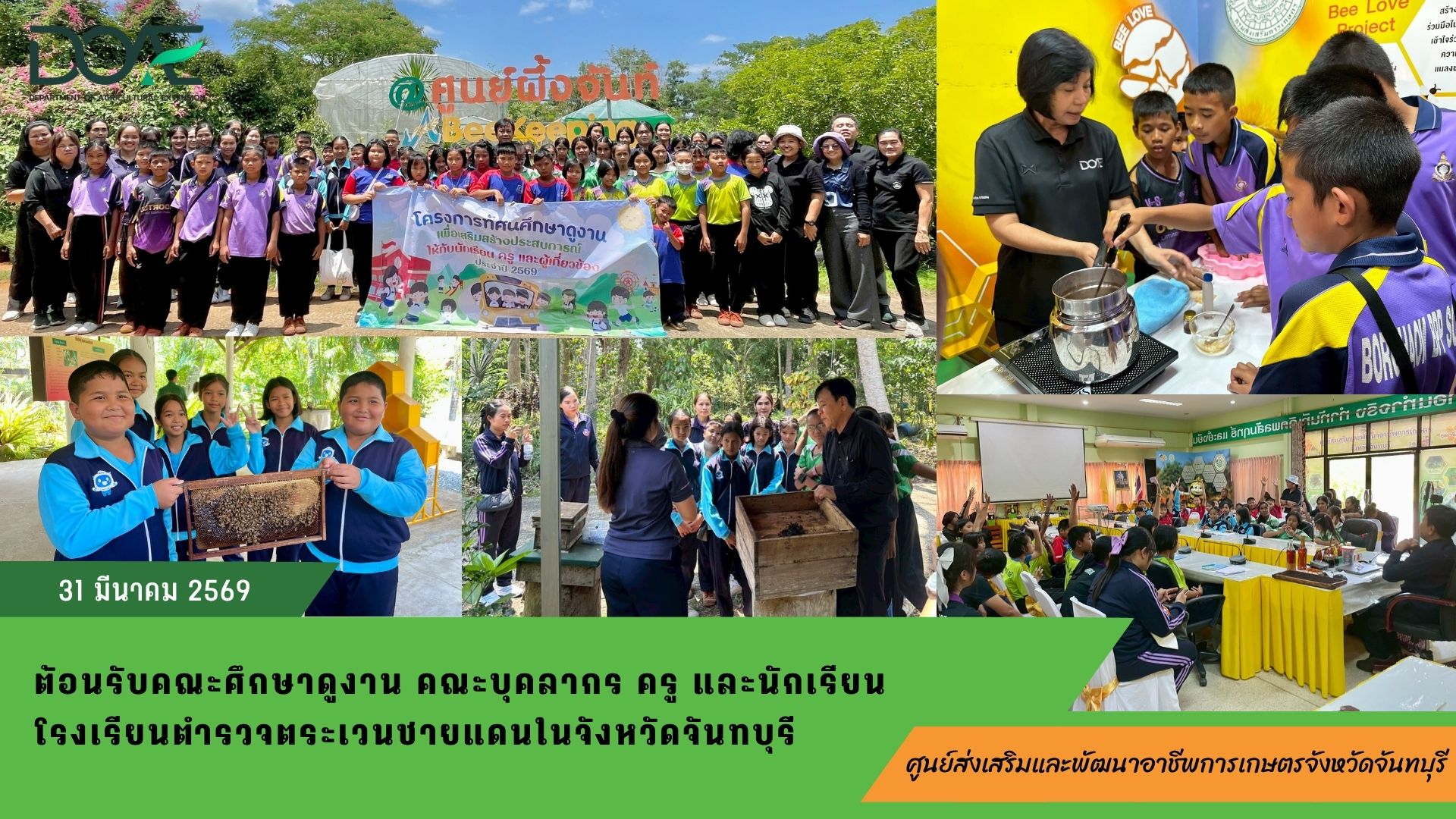 ดำเนินการศึกษาทดสอบการใช้ชันโรงผสมเกสรในต้นกาแฟ ภายในศูนย์เรียนรู้เกษตรนวัต สถาบันเทคโนโลยีจิตรลดา อำเภอวังจันทร์ จังหวัดระยอง24 เมษายน 2026ถ่ายทอดองค์ความรู้ การเพาะเลี้ยงชันโรงปลอดภัย ภายใต้โครงการยกรัดับการผลิตสินค้าเกษตรปลอดภัยได้มาตรฐานด้วยแนวทาง BCG MODEL แบบบูรณาการสู่เศรษฐกิจฐานราก23 เมษายน 2026ร่วมประชุมคณะทำงานขับเคลื่อนงานด้านการเกษตรระดับอำเภอ (SCD) อำเภอเมืองจันทบุรี จังหวัดจันทบุรี21 เมษายน 2026ร่วมกิจกรรมจิตอาสาพัฒนาพื้นที่บริเวณถนนสาย 3546 เพื่อเตรียมความพร้อมรองรับการจัดงานวันไหลสงกรานต์ของอำเภอมะขาม จังหวัดจันทบุรี16 เมษายน 2026ร่วมพิธีเปิดงานการนำคู่มือการบริหารจัดการโครงการอันเนื่องมาจากพระราชดำริเชิงพื้นที่ ด้วยกระบวนการ ONE PLAN มาสนับสนุนการดำเนินงานในเขตพื้นที่ภาคกลาง8 เมษายน 2026ร่วมประชุมซักซ้อมแนวทางการปฏิบัติงานของพนักงานเจ้าหน้าที่ ตามพระราชบัญญัติมาตราฐานสินค้าเกษตร พ.ศ. 25518 เมษายน 2026เข้าร่วมประชุมร่วมประชุมเกษตรอำเภอประจำเดือน (Monthly Meeting : MM) ครั้งที่ 6/2569 ของสำนักงานเกษตรจังหวัดตราด7 เมษายน 2026ติดตามเยี่ยมเยียนเกษตรกรผู้เลี้ยงชันโรง เลี้ยงไข่ผำ ไบโอชาร์ พื้นที่อำเภอขลุง และอำเภอแหลมสิงห์ จังหวัดจันทบุรี3 เมษายน 2026เข้าร่วมประชุมหัวหน้าส่วนราชการ หัวหน้าหน่วยงาน ผู้บริหารท้องถิ่น ผู้บริหารรัฐวิสาหกิจ ผู้บริหารสถานศึกษา และคณะกรรมการบริหารอำเภอมะขาม ครั้งที่ 4/25691 เมษายน 2026ต้อนรับคณะศึกษาดูงาน โรงเรียนตำรวจตระเวนชายแดนในจังหวัดจันทบุรี31 มีนาคม 2026ร่วมประชุมคณะกรรมการขับเคลื่อนงานด้านการเกษตรจังหวัดจันทบุรี ครั้งที่ 1/256931 มีนาคม 2026ร่วมจัดนิทรรศการเผยแพร่องค์ความรู้ การบริหารจัดการส่งเสริมการเลี้ยงผึ้งและแมลงเศรษฐกิจ และร่วมกิจกรรมงานเปิดบ้านวิชาการโรงเรียนตำรวจตระเวนชายแดนบ้านน้ำแดง (แอมเวย์อุปถัมภ์) ประจำปีการศึกษา 256827 มีนาคม 2026ร่วมจัดนิทรรศการงานโครงการคลินิกเกษตรเคลื่อนที่ในพระราชานุเคราะห์ สมเด็จพระบรมโอรสาธิราช ฯ สยามมกุฎราชกุมาร (ไตรมาส 2) ประจำปีงบประมาณ 2569 จังหวัดจันทบุรี26 มีนาคม 2026สนับสนุนกล้าผักพันธุ์ดี จำนวน 60 ต้น แก่สำนักงานเกษตรอำเภอขลุง จังหวัดจันทบุรี23 มีนาคม 2026ร่วมจัดนิทรรศการเผยแพร่ความรู้ด้านการเลี้ยงผึ้งหรือชันโรง และร่วมพิธีเปิด ชื่นชมกิจกรรมงานเปิดบ้านวิชาการ โรงเรียนตำรวจตระเวนชายแดนบ้านคลองมะลิประเวศน์วิทยา ประจำปีการศึกษา 256920 มีนาคม 2026ร่วมประชุมคณะทำงานขับเคลื่อนงานด้านการเกษตรระดับอำเภอ (SCD) อำเภอสอยดาว จังหวัดจันทบุรี20 มีนาคม 2026ร่วมจัดนิทรรศการงานโค