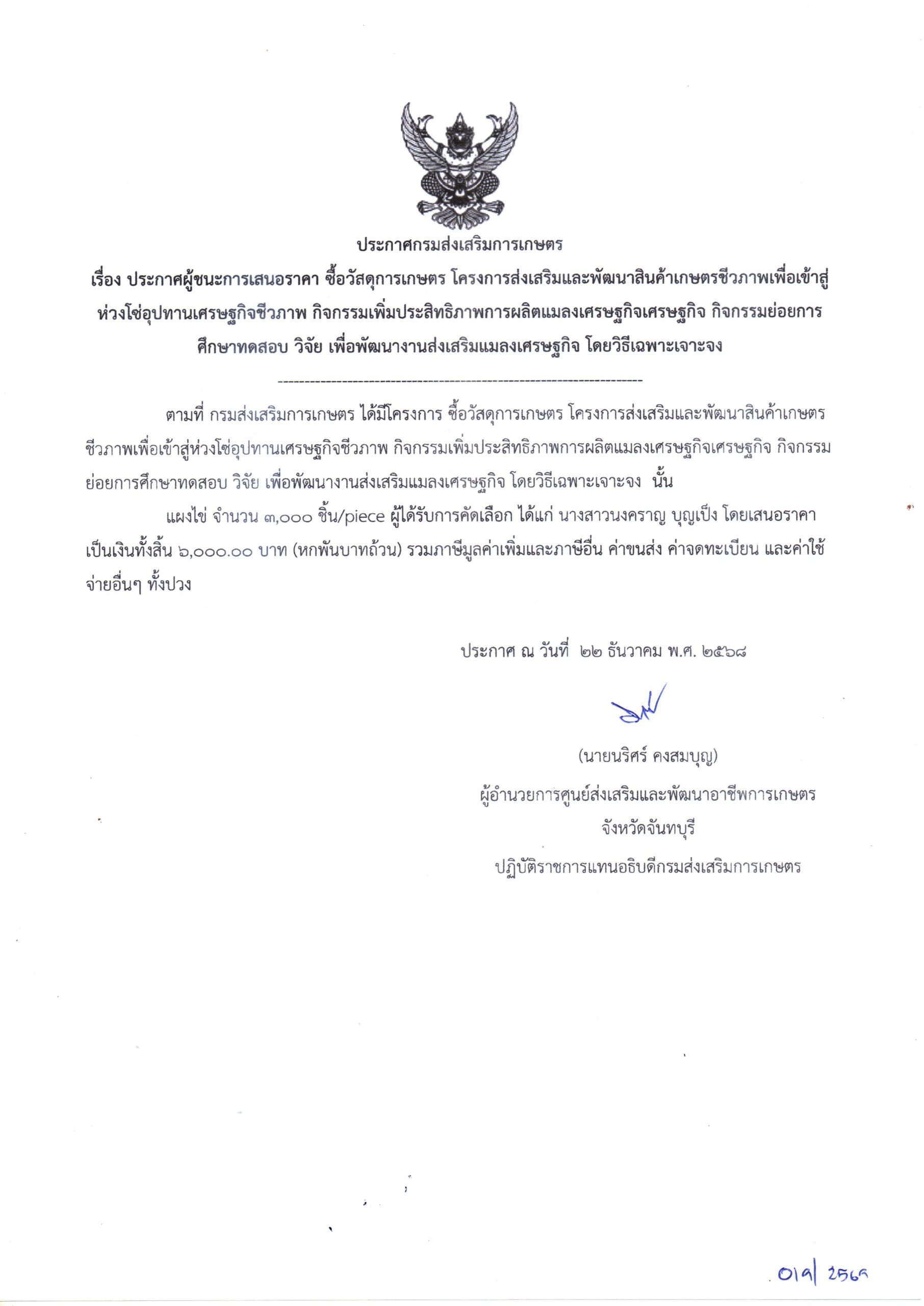 จัดซื้อวัสดุการเกษตร โครงการส่งเสริมและพัฒนาสินค้าเกษตรชีวภาพเพื่อเข้าสู่ห่วงโซ่อุปทานเศรษฐกิจชีวภาพ กิจกรรมเพิ่มประสิทธิภาพการผลิตแมลงเศรษฐกิจ กิจกรรมย่อยศึกษาทดสอบ วิจัย เพื่อพัฒนางานส่งเสริมแมลงเศรษฐกิจ โดยวิธีเฉพาะเจาะจง เป็นเงิน 6,000.00 บาท22 ธันวาคม 2025