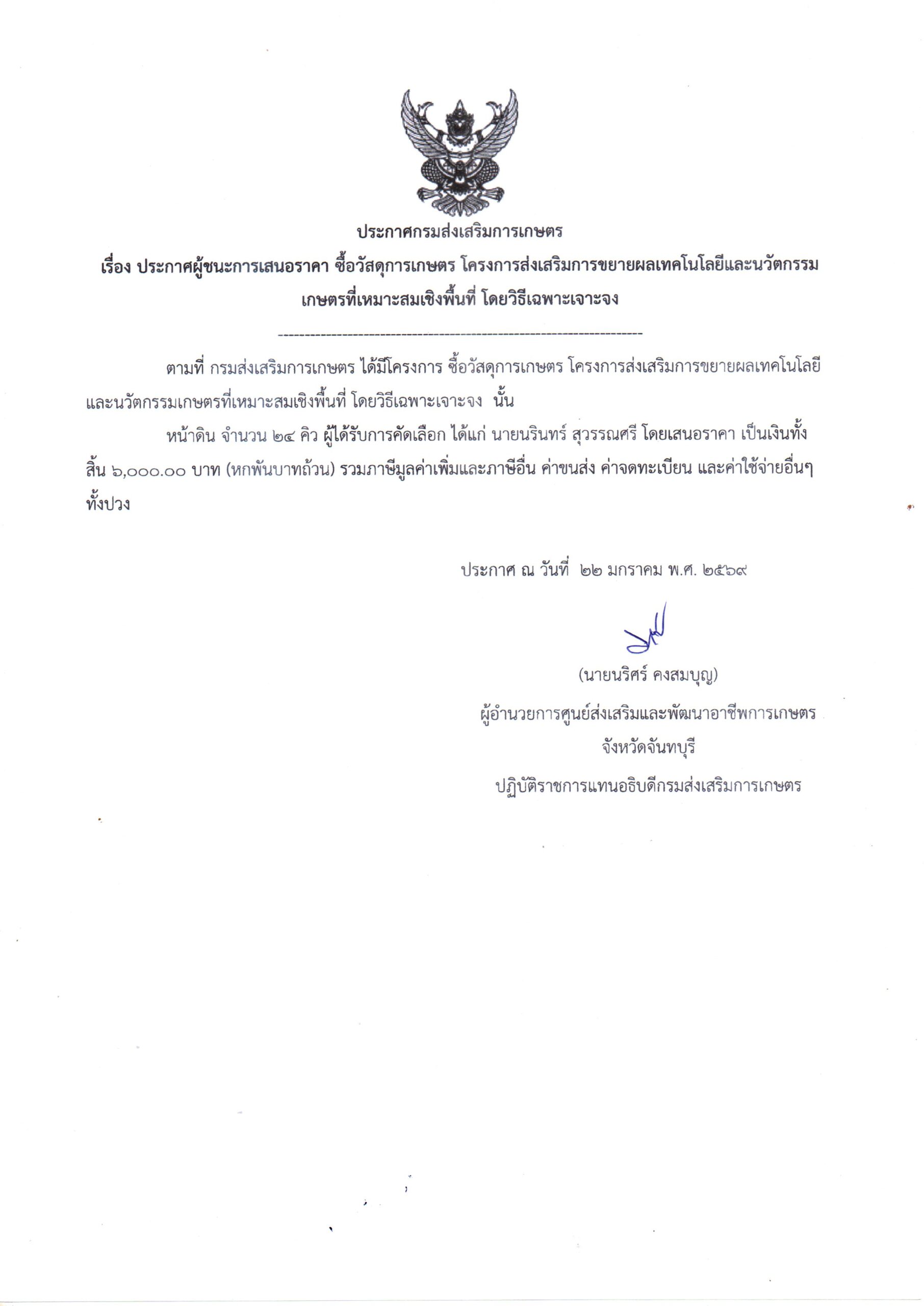 จัดซื้อวัสดุการเกษตร โครงการส่งเสริมการขยายผลเทคโนโลยีและนวัตกรรมเกษตรที่เหมาะสมเชิงพื้นที่ โดยวิธีเฉพาะเจาะจง เป็นเงิน 6,000.00 บาท22 มกราคม 2026