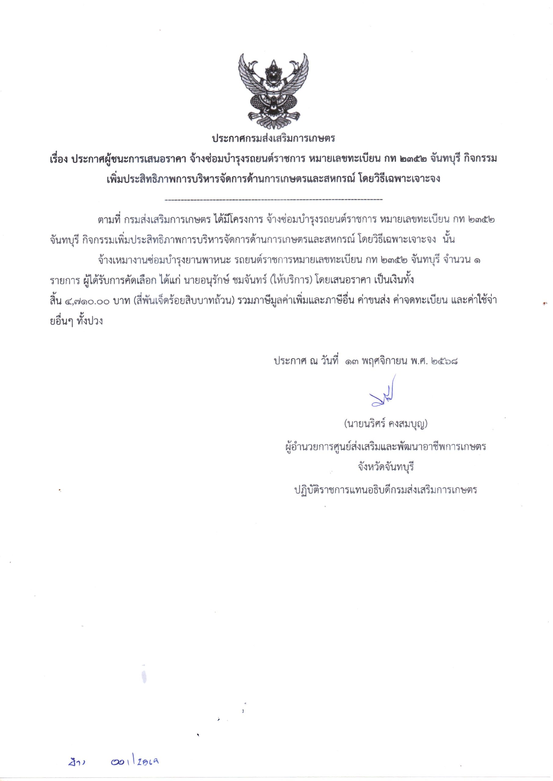 จัดจ้าง ซ่อมบำรุงรถยนต์ราชการ หมายเลขทะเบียน กท 2352 จันทบุรี กิจกรรมเพิ่มประสิทธิภาพการบริหารจัดการด้านการเกษตรและสหกรณ์ โดยวิธีเฉพาะเจาะจง เป็นเงิน 4,710.00 บาท13 พฤศจิกายน 2025
