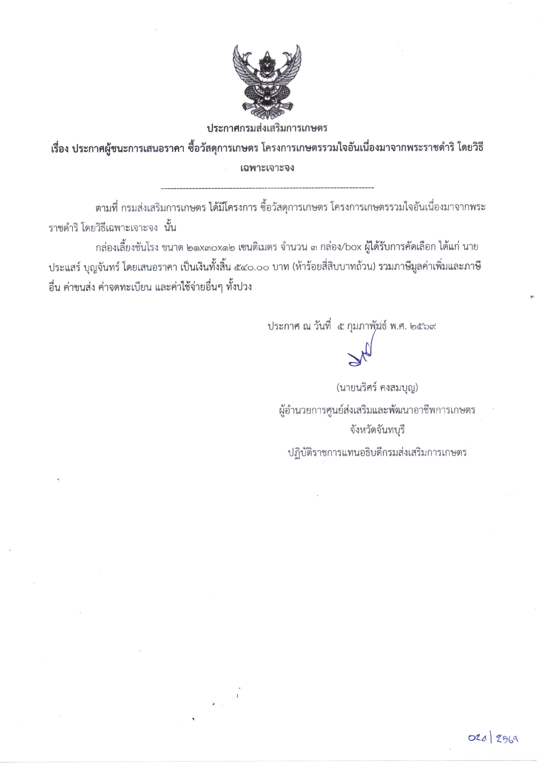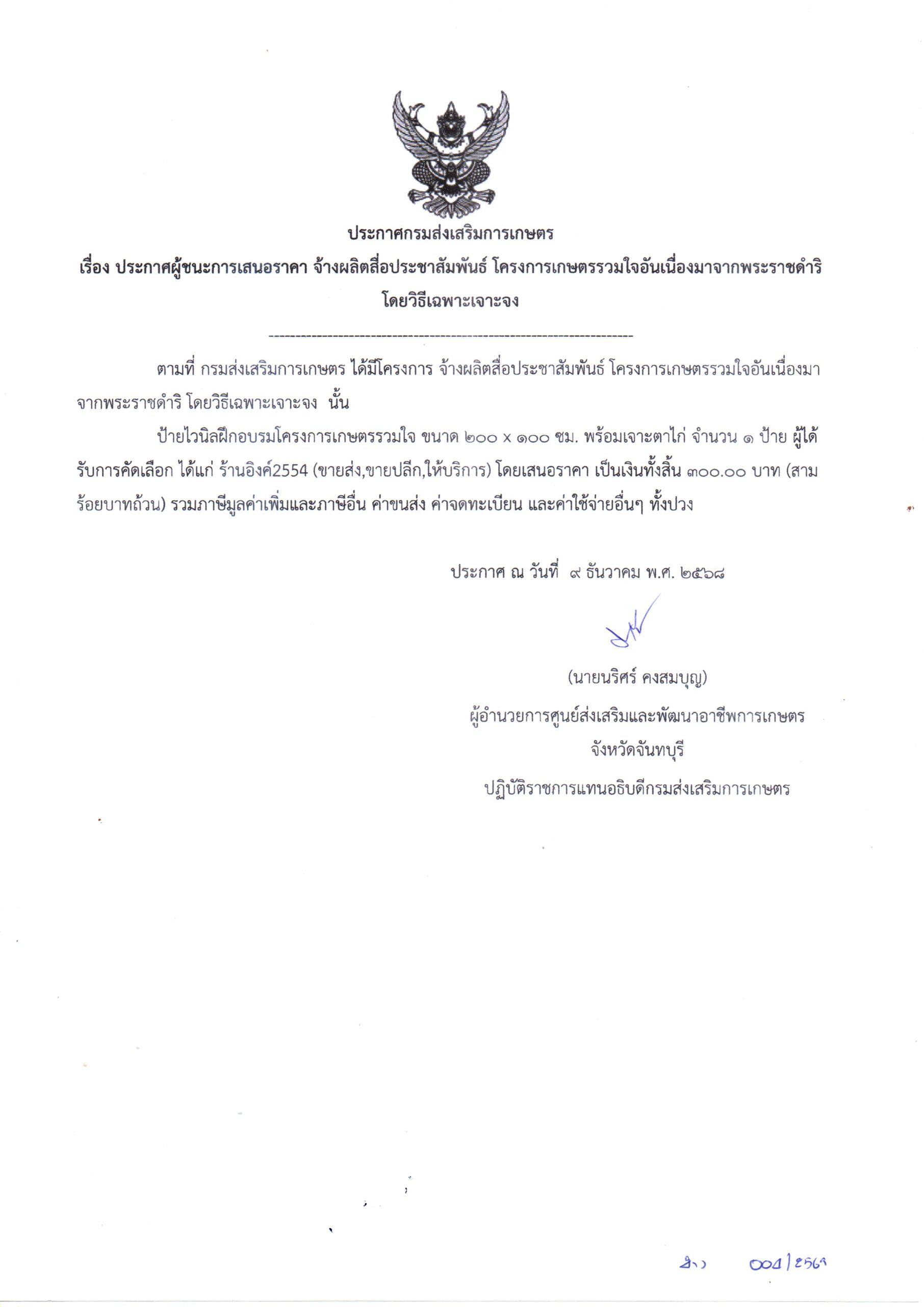 จัดจ้างผลิตสื่อประชาสัมพันธ์ โครงการเกษตรรวมใจอันเนื่องมาจากพระราชดำริ โดยวิธีเฉพาะเจาะจง เป็นเงิน 300.00 บาท9 ธันวาคม 2025