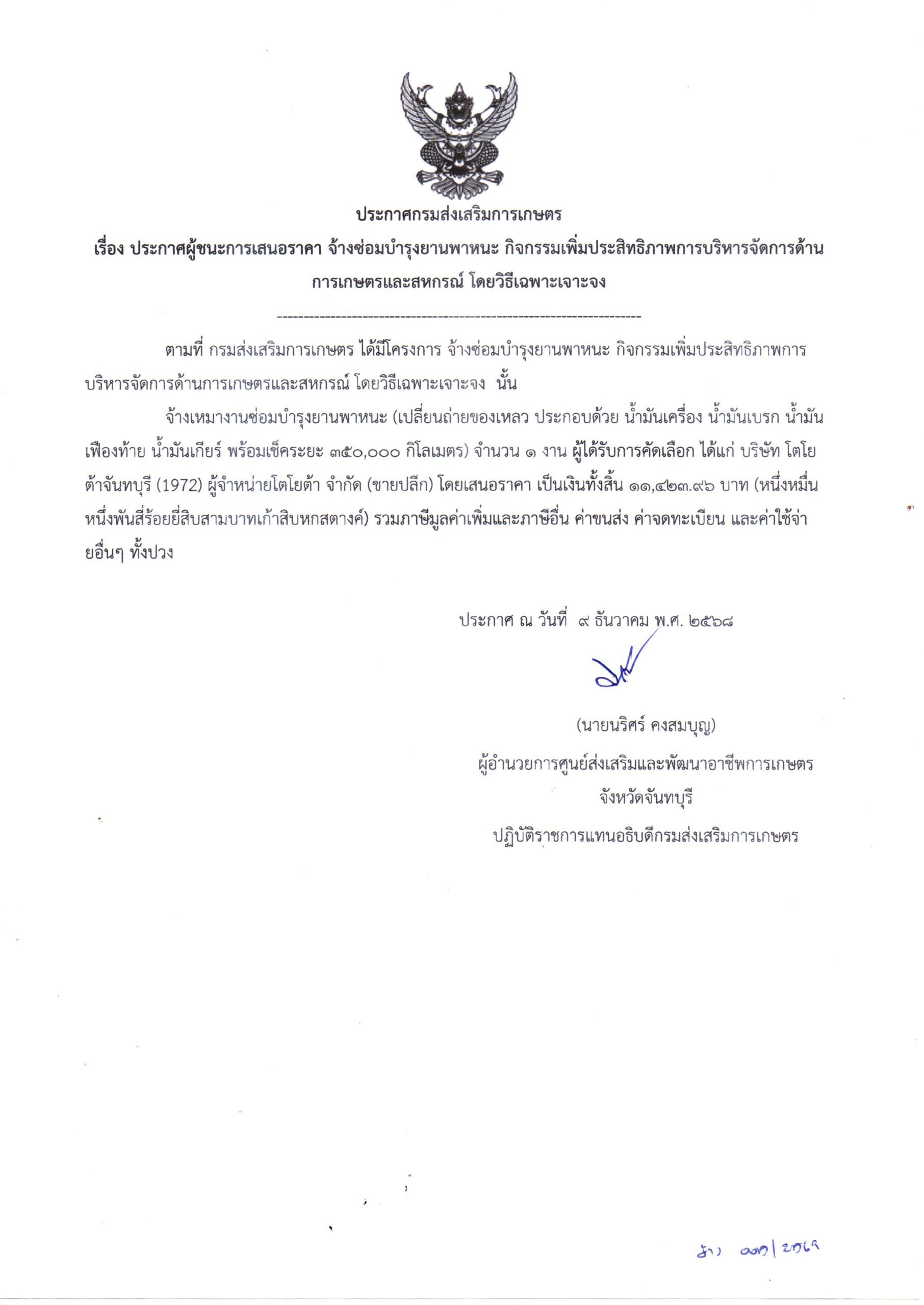 จัดจ้าง ซ่อมบำรุงรักษายานพาหนะ กิจกรรมเพิ่มประสิทธิภาพการบริหารจัดการด้านการเกษตรและสหกรณ์ โดยวิธีเฉพาะเจาะจง เป็นเงิน 11,423.96.00 บาท9 ธันวาคม 20259 มกราคม 2026…