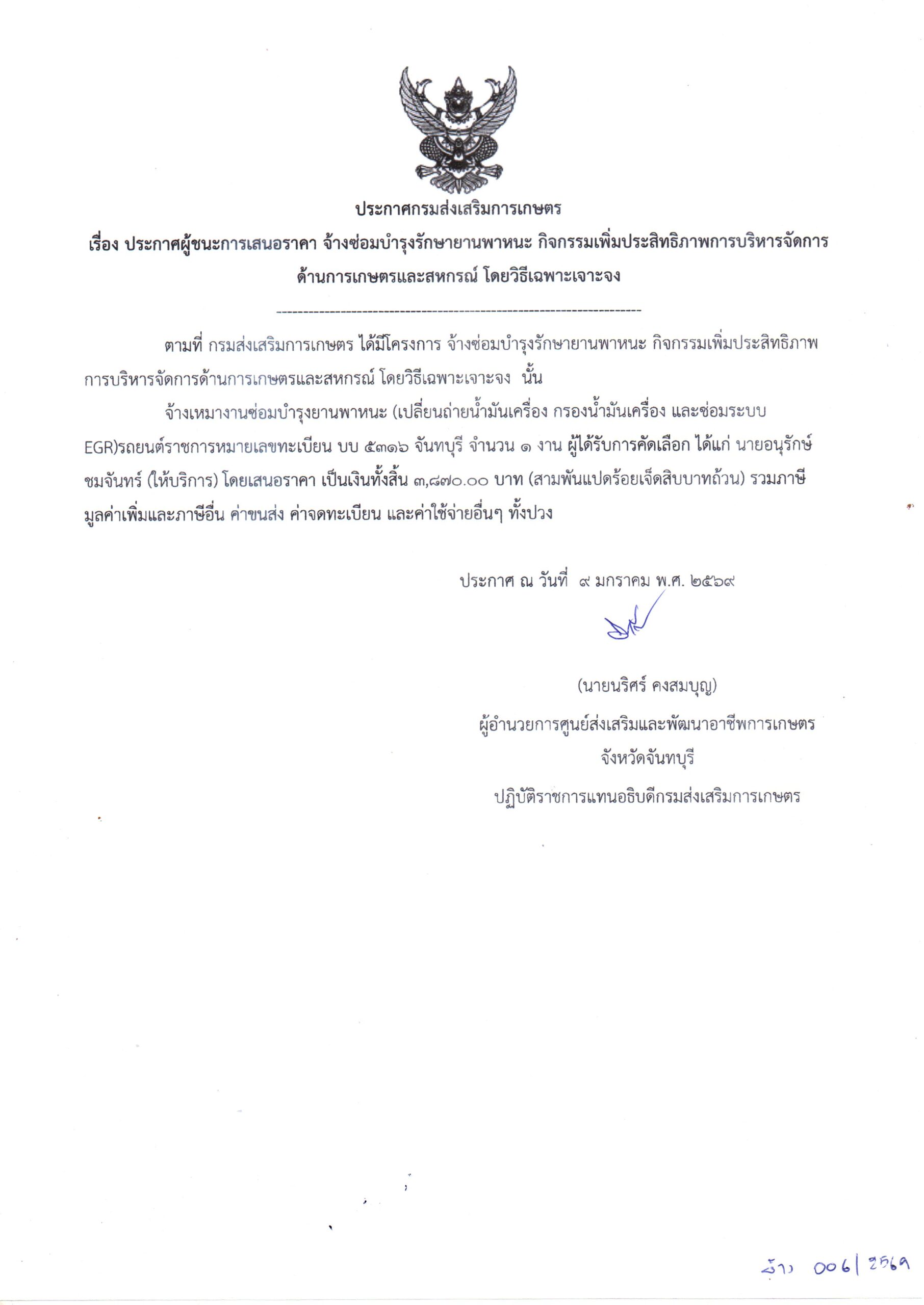 จัดจ้าง ซ่อมบำรุงรักษายานพาหนะ กิจกรรมเพิ่มประสิทธิภาพการบริหารจัดการด้านการเกษตรและสหกรณ์ โดยวิธีเฉพาะเจาะจง เป็นเงิน 3,870.00 บาท9 มกราคม 2026