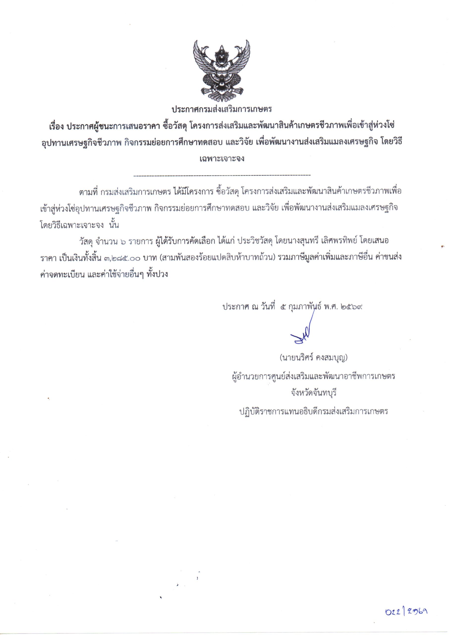 จัดซื้อวัสดุการเกษตร โครงการส่งเสริมและพัฒนาสินค้าเกษตรชีวภาพเพื่อเข้าสู่ห่วงโซ่อุปทานเศรษฐกิจชีวภาพ กิจกรรมเพิ่มประสิทธิภาพการผลิตแมลงเศรษฐกิจ กิจกรรมย่อยศึกษาทดสอบ วิจัย เพื่อพัฒนางานส่งเสริมแมลงเศรษฐกิจ โดยวิธีเฉพาะเจาะจง เป็นเงิน 3,285.00 บาท5 กุมภาพันธ์ 2026