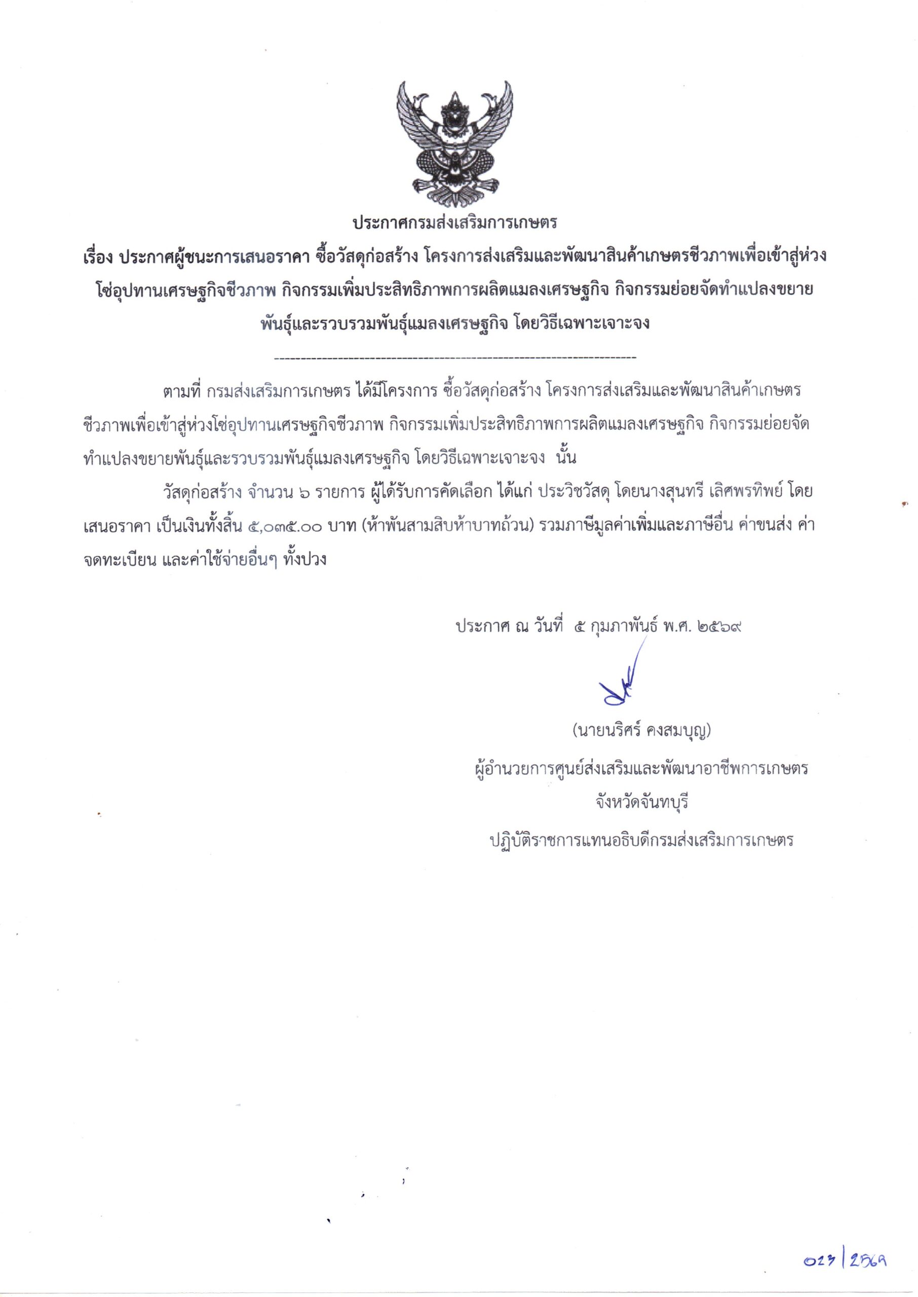 จัดซื้อวัสดุก่อสร้าง โครงการส่งเสริมและพัฒนาสินค้าเกษตรชีวภาพเพื่อเข้าสู่ห่วงโซ่อุปทานเศรษฐกิจชีวภาพ กิจกรรมเพิ่มประสิทธิภาพการผลิตแมลงเศรษฐกิจ กิจกรรมย่อยจัดทำแปลงขยายพันธุ์และรวบรวมพันธุ์แมลงเศรษฐกิจ โดยวิธีเฉพาะเจาะจง เป็นเงิน 5,035.00 บาท5 กุมภาพันธ์ 2026