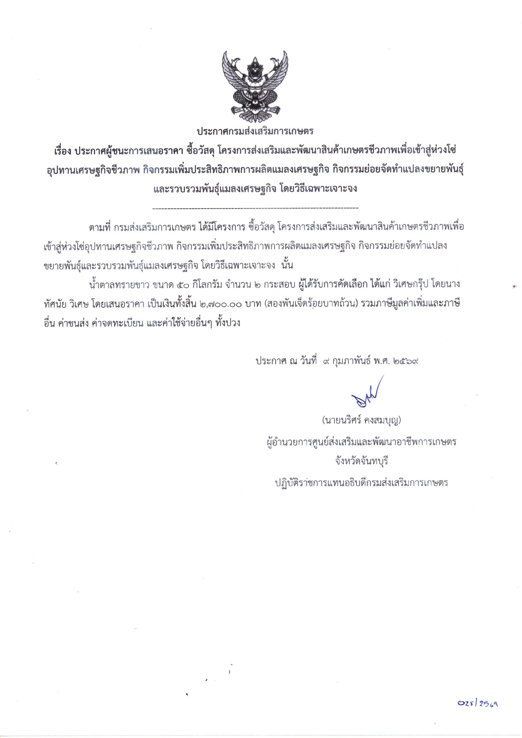 จัดซื้อวัสดุการเกษตร โครงการส่งเสริมและพัฒนาสินค้าเกษตรชีวภาพเพื่อเข้าสู่ห่วงโซ่อุปทานเศรษฐกิจชีวภาพ กิจกรรมเพิ่มประสิทธิภาพการผลิตแมลงเศรษฐกิจ กิจกรรมย่อยการศึกษาทดสอบ วิจัย เพื่อพัฒนางานส่งเสริมแมลงเศรษฐกิจ โดยวิธีเฉพาะเจาะจง เป็นเงิน 21,400.00 บาท12 ธันวาคม 2025