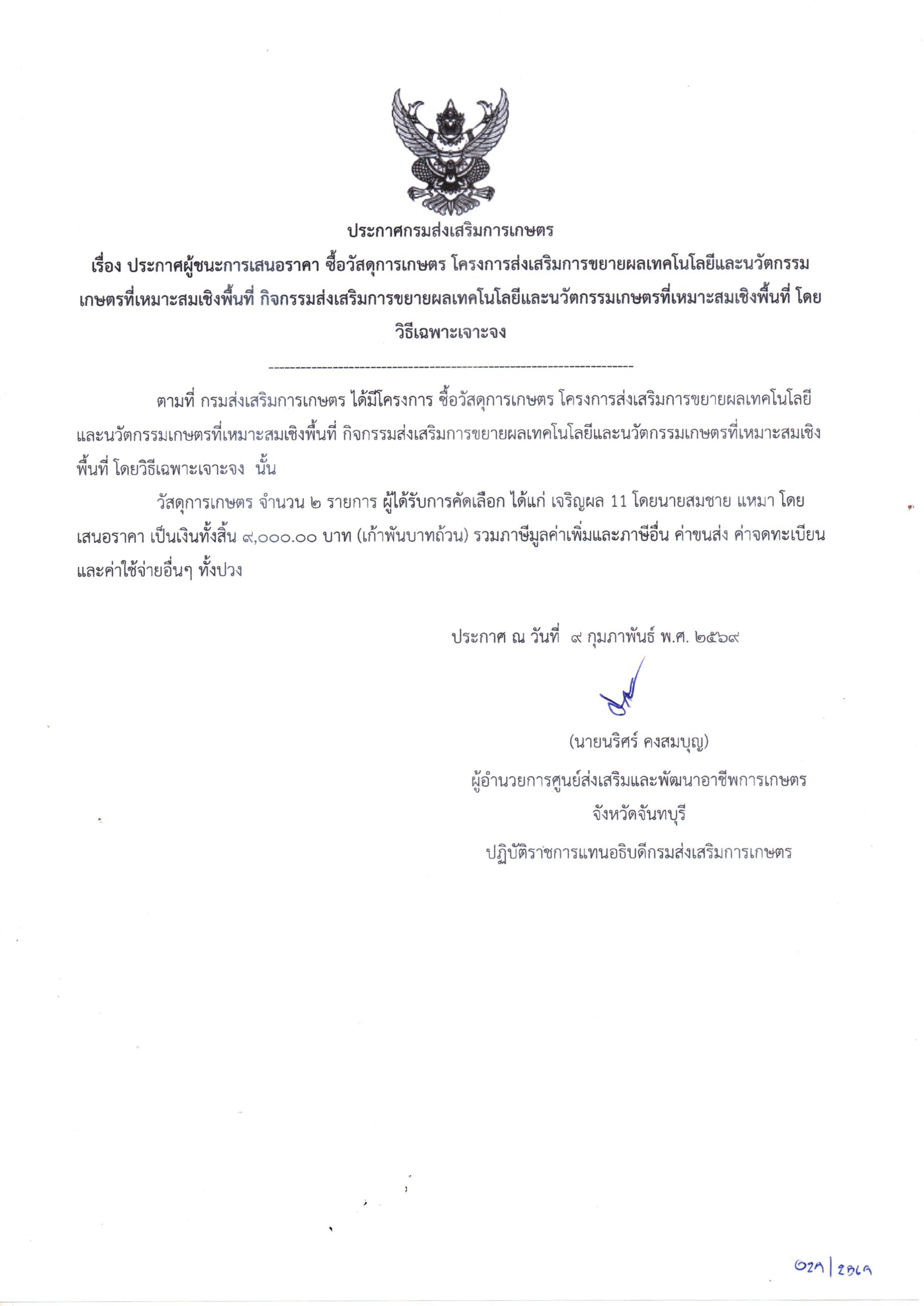 จัดซื้อวัสดุการเกษตร โครงการส่งเสริมการขยายผลเทคโนโลยีและนวัตกรรมเกษตรที่เหมาะสมเชิงพื้นที่ โดยวิธีเฉพาะเจาะจง เป็นเงิน 9,000.00 บาท9 กุมภาพันธ์ 2026