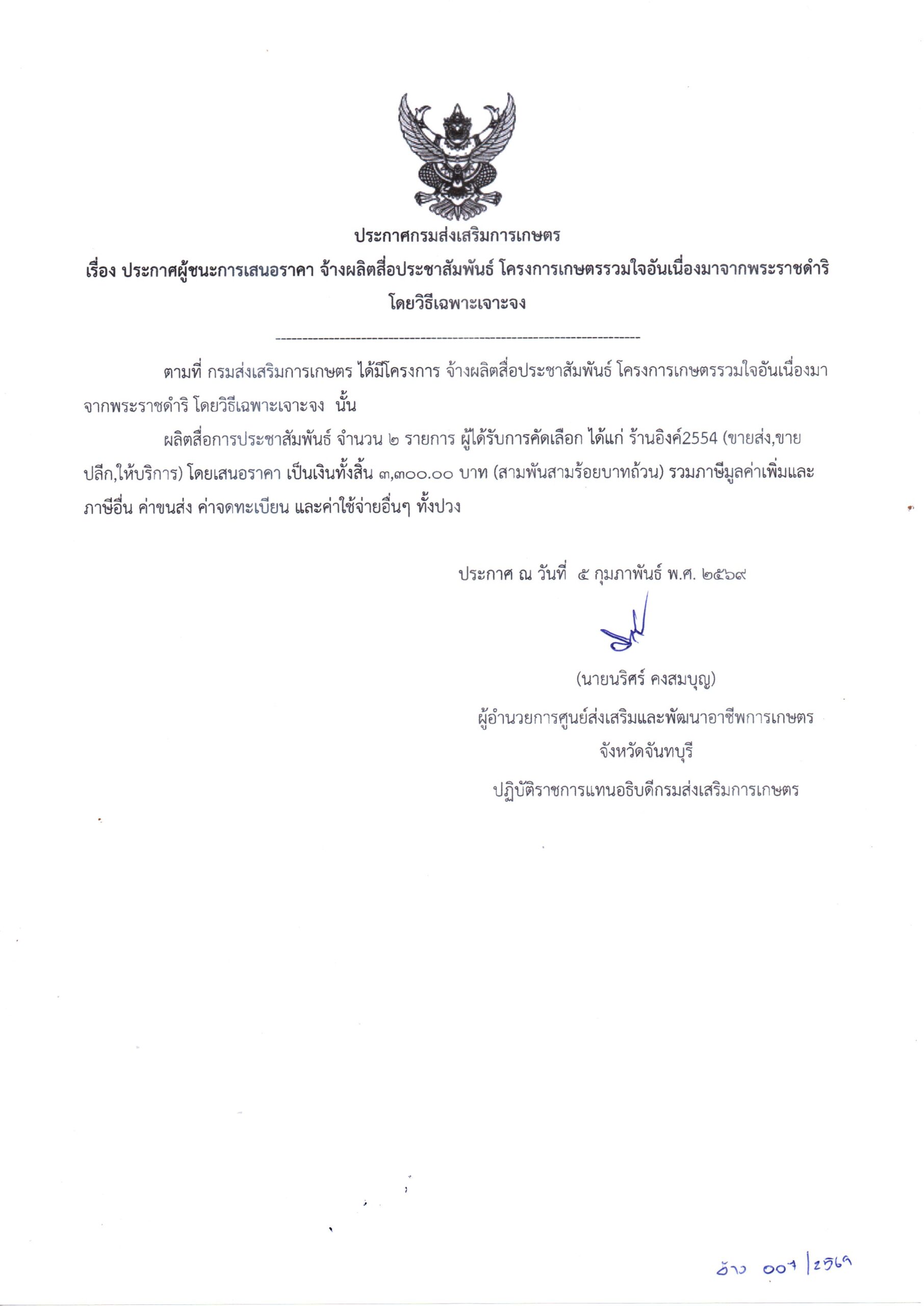 จัดจ้างผลิตสื่อประชาสัมพันธ์ โครงการเกษตรรวมใจอันเนื่องมาจากพระราชดำริ โดยวิธีเฉพาะเจาะจง เป็นเงิน 3,300.00 บาท5 กุมภาพันธ์ 2026