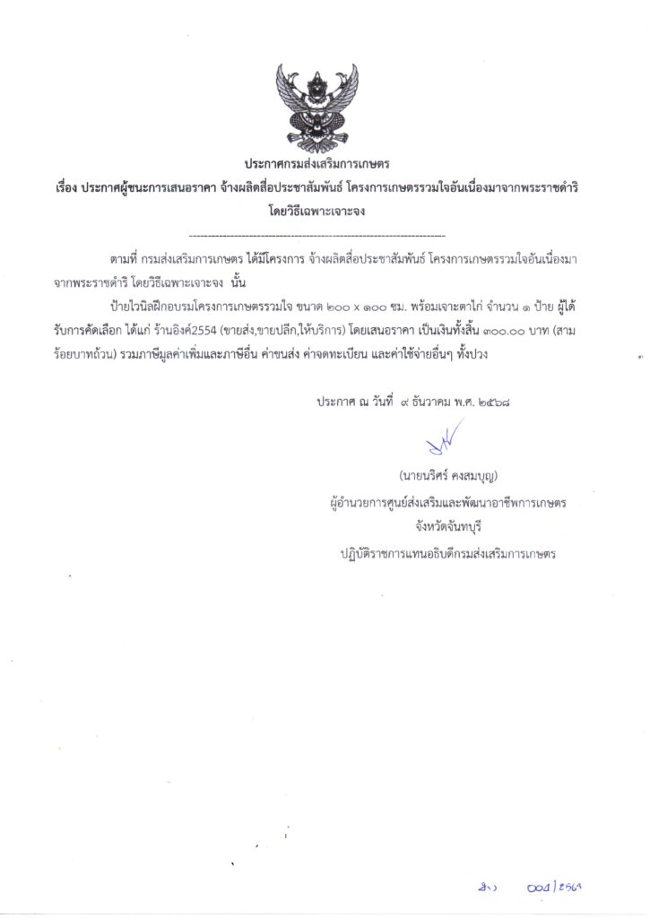 จัดจ้างผลิตสื่อประชาสัมพันธ์ โครงการศูนย์เรียนรู้เกษตรนวัต สถาบันเทคโนโลยีจิตรลดา อำเภอวังจันทร์ จังหวัดระยอง โดยวิธีเฉพาะเจาะจง เป็นเงิน 900.00 บาท