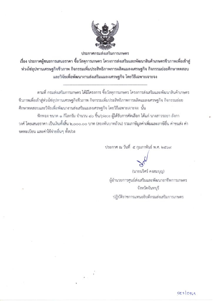 Previous จัดซื้อวัสดุการเกษตร โครงการส่งเสริมและพัฒนาสินค้าเกษตรชีวภาพเพื่อเข้าสู่ห่วงโซ่อุปทานเศรษฐกิจชีวภาพ กิจกรรมเพิ่มประสิทธิภาพการผลิตแมลงเศรษฐกิจ กิจกรรมย่อยศึกษาทดสอบ วิจัย เพื่อพัฒนางานส่งเสริมแมลงเศรษฐกิจ โดยวิธีเฉพาะเจาะจง เป็นเงิน 1,300.00 บาท