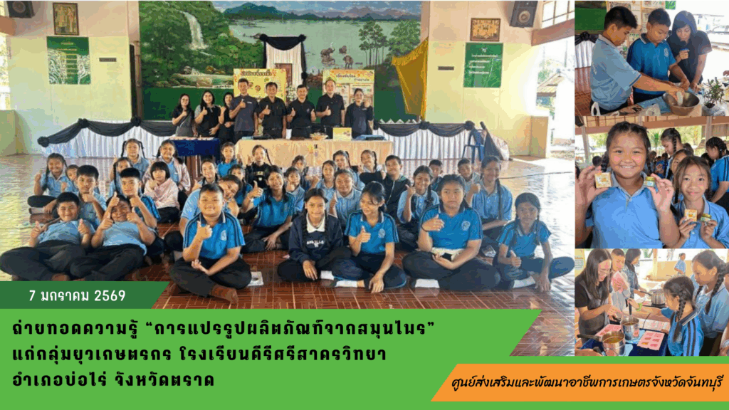 ข่าวประชาสัมพันธ์ 2569ถ่ายทอดความรู้ “การแปรรูปผลิตภัณฑ์จากสมุนไพร” แก่กลุ่มยุวเกษตรกร โรงเรียนคีรีศรีสาครวิทยา อำเภอบ่อไร่ จังหวัดตราด 7 มกราคม 2026