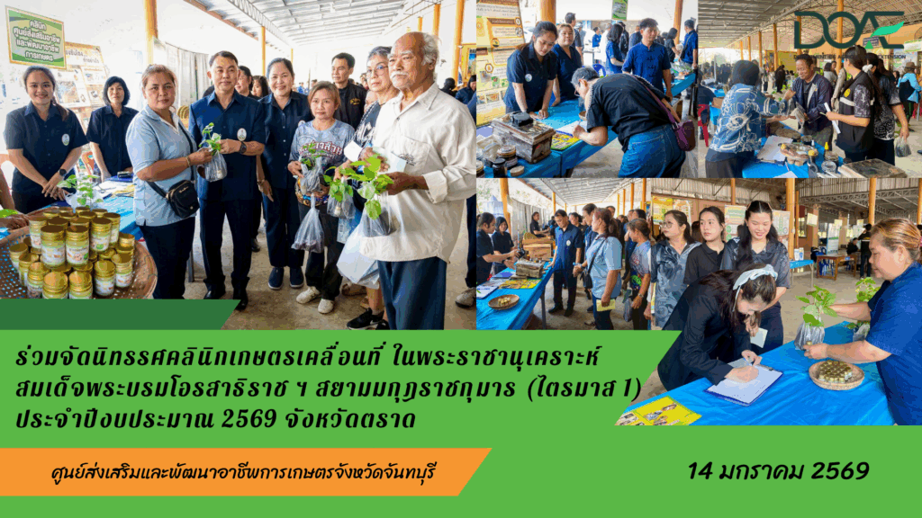 ข่าวประชาสัมพันธ์ 2569ร่วมจัดนิทรรศการงานโครงการคลินิกเกษตรเคลื่อนที่ในพระราชานุเคราะห์ สมเด็จพระบรมโอรสาธิราช ฯ สยามมกุฎราชกุมาร (ไตรมาส 1) ประจำปีงบประมาณ 2569 จังหวัดตราด 14 มกราคม 2026