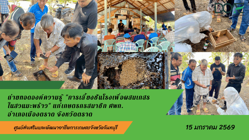 ข่าวประชาสัมพันธ์ 2569ถ่ายทอดองค์ความรู้ “การเลี้ยงชันโรงเพื่อผสมเกสรในสวนมะพร้าว” แก่เกษตรกรสมาชิก ศพก. อำเภอเมืองตราด จังหวัดตราด 15 มกราคม 2026