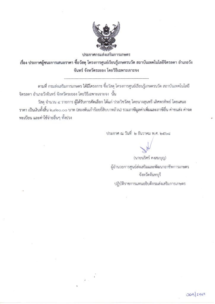 จัดซื้อจัดจ้าง 2569จัดซื้อวัสดุ โครงการศูนย์เรียนรู้เกษตรนวัต สถาบันเทคโนโลยีจิตรลดา อำเภอวังจันทร์ จังหวัดระยอง โดยวิธีเฉพาะเจาะจง เป็นเงิน 2,920.00 บาท 2 ธันวาคม 2025