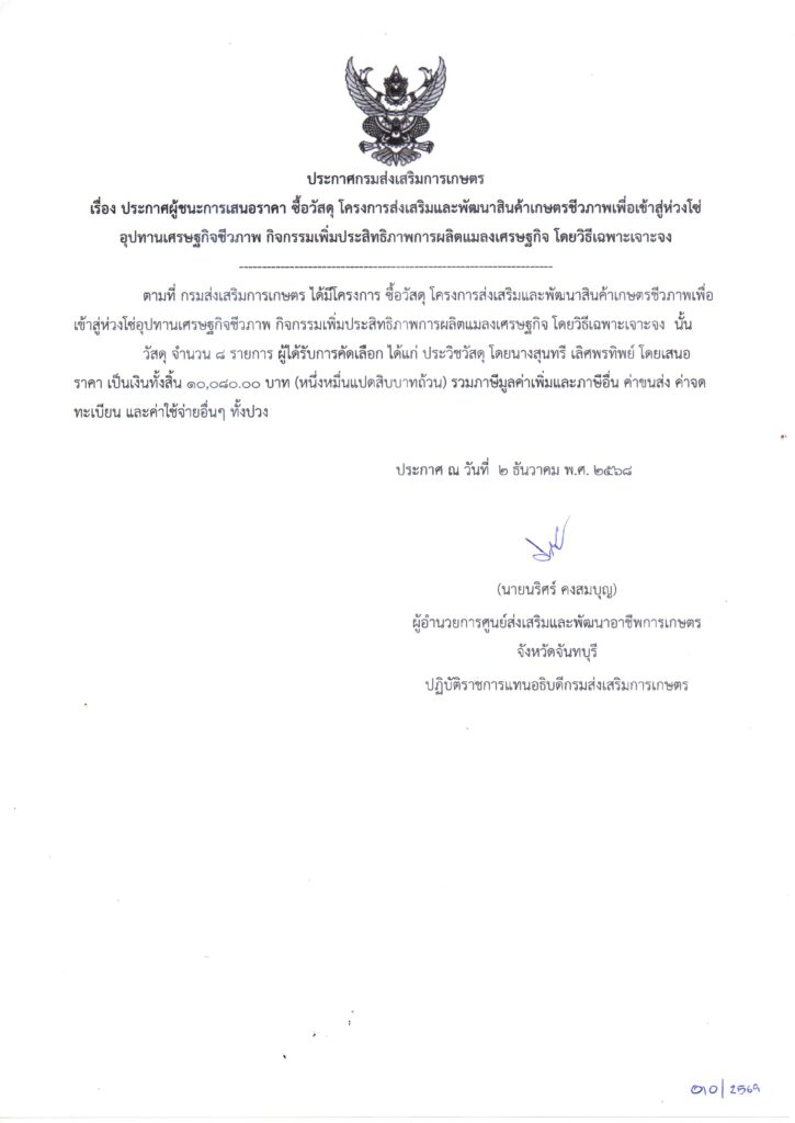 จัดซื้อจัดจ้าง 2569จัดซื้อวัสดุการเกษตร โครงการส่งเสริมและพัฒนาสินค้าเกษตรชีวภาพเพื่อเข้าสู่ห่วงโซ่อุปทานเศรษฐกิจชีวภาพ กิจกรรมเพิ่มประสิทธิภาพการผลิตแมลงเศรษฐกิจ กิจกรรมย่อยการศึกษาทดสอบ วิจัย เพื่อพัฒนางานส่งเสริมแมลงเศรษฐกิจ โดยวิธีเฉพาะเจาะจง เป็นเงิน 21,400.00 บาท 12 ธันวาคม 2025