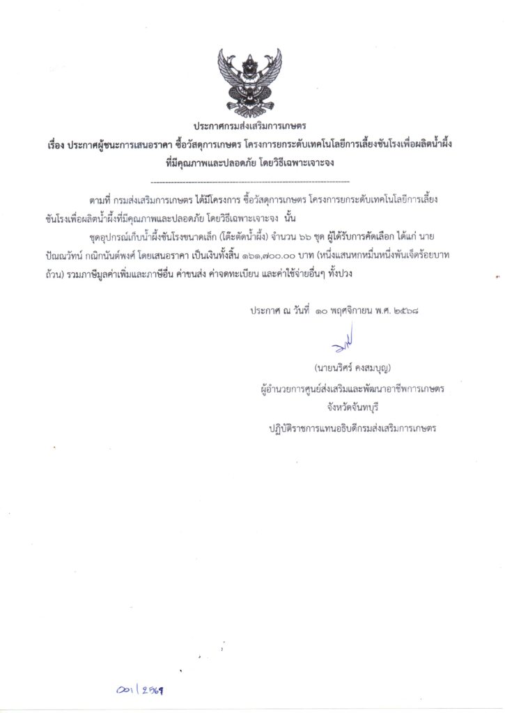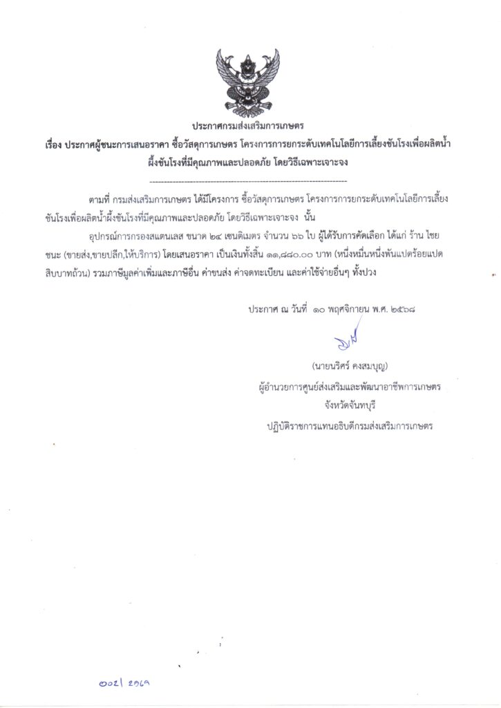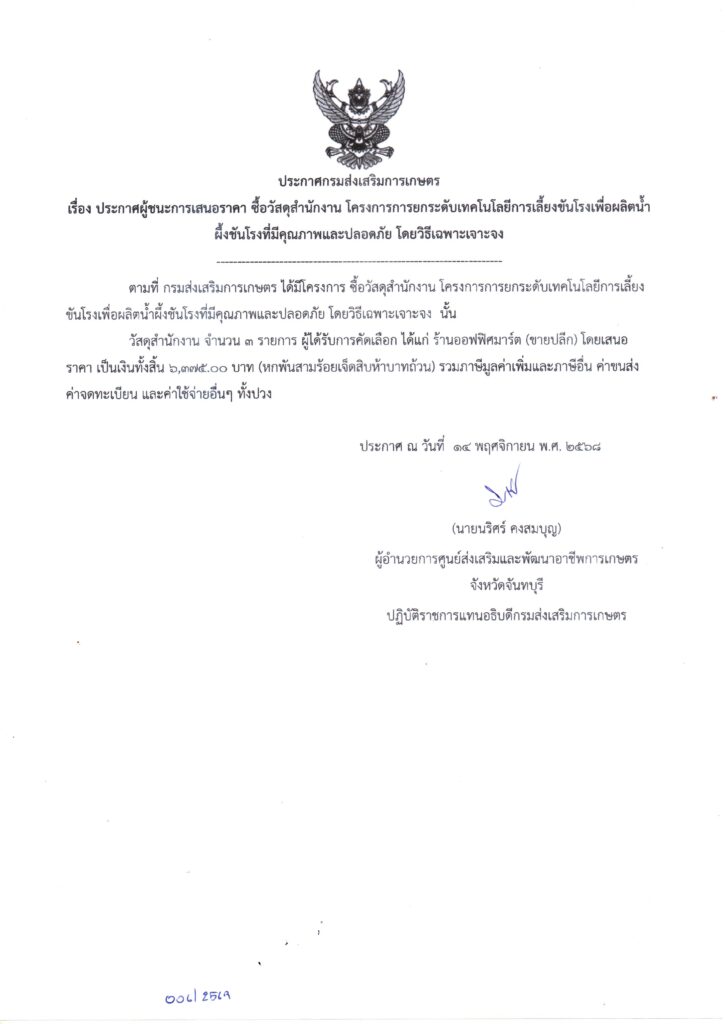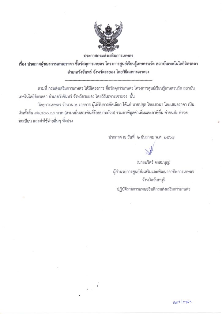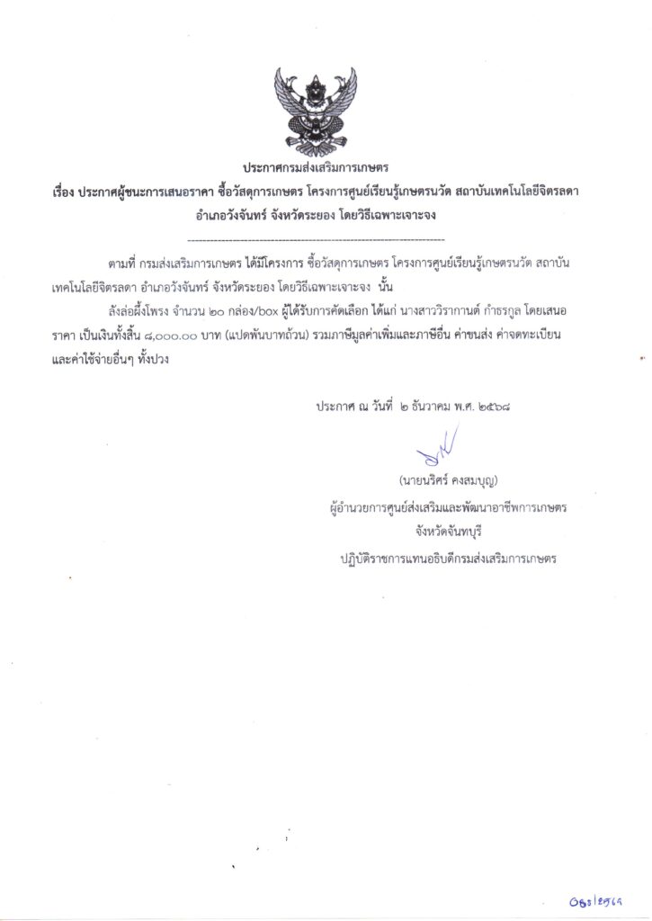 จัดซื้อจัดจ้าง 2569จัดซื้อวัสดุการเกษตร โครงการศูนย์เรียนรู้เกษตรนวัต สถาบันเทคโนโลยีจิตรลดา อำเภอวังจันทร์ จังหวัดระยอง โดยวิธีเฉพาะเจาะจง เป็นเงิน 8,000.00 บาท 2 ธันวาคม 2025