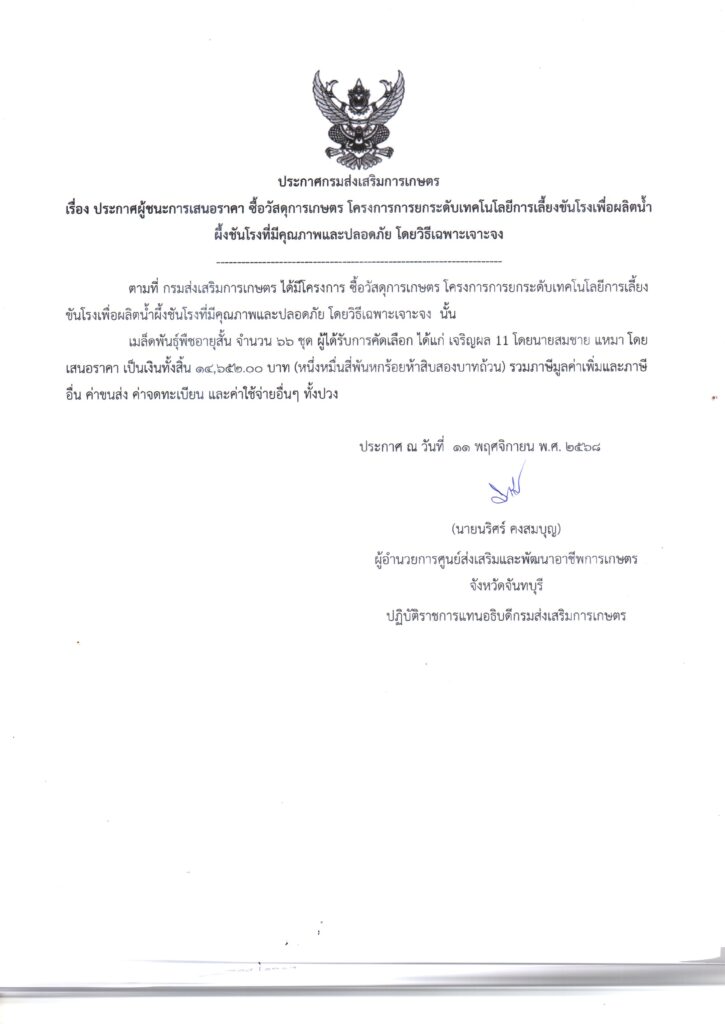 จัดซื้อจัดจ้าง 2569จัดซื้อวัสดุการเกษตร โครงการศูนย์เรียนรู้เกษตรนวัต สถาบันเทคโนโลยีจิตรลดา อำเภอวังจันทร์ จังหวัดระยอง โดยวิธีเฉพาะเจาะจง เป็นเงิน 32,400.00 บาท 2 ธันวาคม 2025 Add Post
