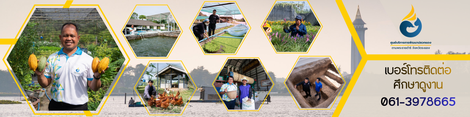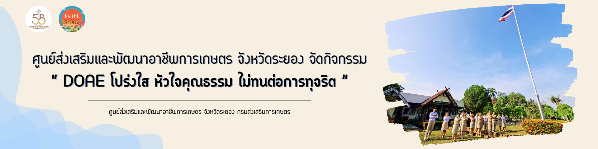 ศูนย์ส่งเสริมและพัฒนาอาชีพการเกษตร จังหวัดระยองโครงการศูนย์บริการการพัฒนาปลวกแดงตามพระ จุดเรียนรู้ ศสพ.ระยอง จุดเรียนรู้ไม้ผลไม้ยืนต้น จุดเรียนรู้ไม้ดอกไม้ประดับ จุดเรียนรู้การเกษตรตามแนวทางเศรษฐกิจพอเพียง จุดเรียนรู้ยางพารา จุดเรียนรู้ผัก เห็ด และสมุนไพร จุดเรียนรู้การผลิตและการใช้สารชีวภัณฑ์ โครงการอันเนื่องมาจากพระราชดำริ โครงการอนุรักษ์พันธุกรรมพืชอันเนื่องมาจากพระราชดำริ สมเด็จพระเทพรัตนราชสุดาฯ สยามบรมราชกุมารี (อพ.สธ.) โครงการศูนย์บริการการพัฒนาปลวกแดงตามพระราชดำริ จังหวัดระยอง ภาพข่าวและกิจกรรม ศสพ.ระยอง ออกตรวจติดตามการปฏิบัติงาน ศูนย์ปฏิบัติการป้องกันและลดอุบัติเหตุทางถนน ช่วงเทศการสงกรานต์ พ.ศ.2569 จังหวัดระยอง11 เมษายน 2026 ศสพ.ระยอง ร่วมพิธีเปิด " ศูนย์เรียนรู้ชันโรงมะขามคู่ " ณ ศูนย์เรียนรู้ชันโรงมะขามคู่ อำเภอนิคมพัฒนา จังหวัดระยอง10 เมษายน 2026 ศสพ.ระยอง ให้คำปรึกษาและสนับสนุน " สารชีวภัณฑ์ " ให้กับเกษตรกรผู้ผลิตพืชผัก ต.บ้านแลง อ.เมืองระยอง เพื่อใช้สำหรับควบคุมและป้องกันศัตรูพืช10 เมษายน 2026 ศสพ. ระยอง จัดกิจกรรมการเรียนรู้ด้านการเกษตร ประจำเดือนเมษายน 2569 หลักสูตร การผลิตเห็ดนางฟ้าภูฏาน9 เมษายน 2026 ศสพ.ระยอง เข้าร่วมรับฟังงานเปิดตัวโครงการเพิ่มประสิทธิภาพงานส่งเสริมการเกษตรด้วยเทคโนโลยีและนวัตกรรม (DOAE Boost & Shoot)8 เมษายน 2026 ศสพ.ระยอง ให้การต้อนรับคณะดูงานจากองค์การบริหารส่วนตำบลน้ำปั้ว อำเภอเวียงสา จังหวัดน่าน8 เมษายน 2026 ศสพ. ระยอง ถ่ายทอดความรู้และทักษะ การแยกขยายชันโรงในตอไม้ ให้กับเกษตรกร ตำบลหนองละลอก อำเภอบ้านค่าย จังหวัดระยอง ผู้มีความประสงค์เข้ารับบริการ4 เมษายน 2026 ศสพ.ระยอง ให้บริการสนับสนุนต้นพันธุ์ไม้ให้กับเกษตรกรในพื้นที่อำเภอนิคมพัฒนา จังหวัดระยอง3 เมษายน 2026 ศสพ.ระยอง สนับสนุนพันธุ์ไม้ ให้แก่ สถานีตำรวจภูธรมาบตาพุด อำเภอเมือง จังหวัดระยอง3 เมษายน 2026 ภาพข่าวและกิจกรรมอื่นๆ แนะนำศูนย์ส่งเสริมและพัฒนาอาชีพการเกษตร จังหวัดระยอง บอนสีราชินี้ไม้ใบ ตอนที่ 1 การขยายพันธุ์พืช ตอน การเสียบข้าง ดูคลิปอื่นๆ Infographic อื่นๆ