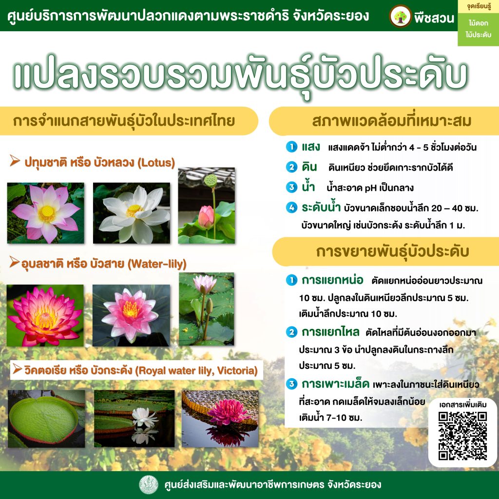 บัว เป็นราชินีแห่งไม้น้ำ จัดเป็นพันธุ์ไม้น้ำที่เป็นสัญลักษณ์ของคุณงามความดี ความบริสุทธิ์ เป็นดอกไม้ที่อยู่คู่สังคมไทยมาช้านาน นอกจากความสวยงามของดอกบัวที่มีหลากหลายสีแล้ว บัวยังมีคุณประโยชน์อีกมาก เช่น มีคุณค่าทางอาหารและใช้เป็นยาบำรุงร่างกายได้ การจำแนกบัวทางพฤกษศาสตร์ แบ่งเป็น 3 สกุล ได้แก่