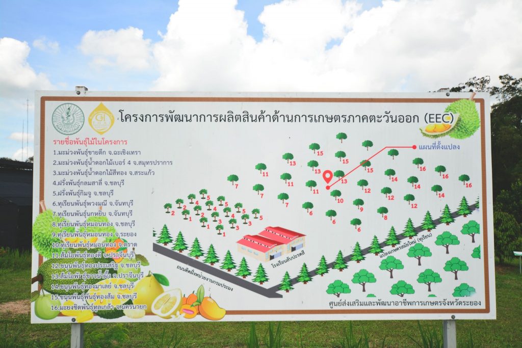 แปลงรวบรวมพันธุ์ไม้ผลที่เหมาะสมกับพื้นที่ภาคตะวันออก อยู่ภายใต้โครงการพัฒนาการผลิตสินค้าเกษตรและการค้าผลไม้ภาคตะวันออก เพื่อพัฒนาความรู้และเพิ่มศักยภาพการทำงานในพื้นที่สำหรับการพัฒนาไม้ผลที่เหมาะสมกับพื้นที่ให้มีคุณภาพได้มาตรฐาน พร้อมส่งเสริมภาพลักษณ์สู่ผู้บริโภคให้มีความรู้ความเข้าใจถึงถิ่นกำเนิด เกิดการสร้างมูลค่าเพิ่มด้วยมาตรฐานการรับรอง GI Geographical Indication และสามารถแข่งขันทางการตลาดได้