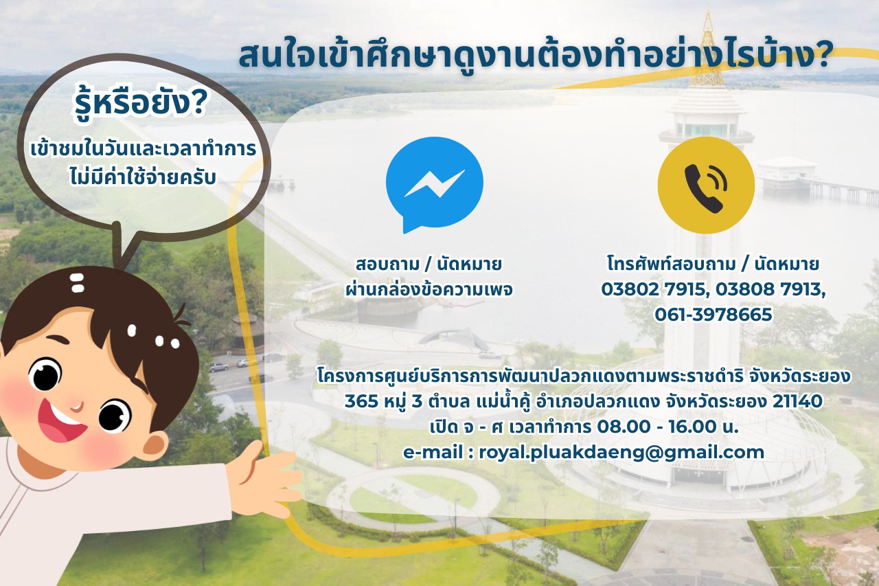 โครงการศูนย์บริการการพัฒนาปลวกแดงตามพระราชดำริ จังหวัดระยอง มุ่งเป็นศูนย์กลางบริการการฝึกอาชีพและแลกเปลี่ยนเรียนรู้ด้านการเกษตร ในพระราชดำริจังหวัดระยองขยายผลสู่ความยั่งยืน มีภารกิจในการสนองพระราชดำริของพระบาทสมเด็จพระบรมชนกาธิเบศร มหาภูมิพลอดุลยเดชมหาราช บรมนาถบพิตร ที่ได้พระราชทานไว้ 4 ประการ คือ