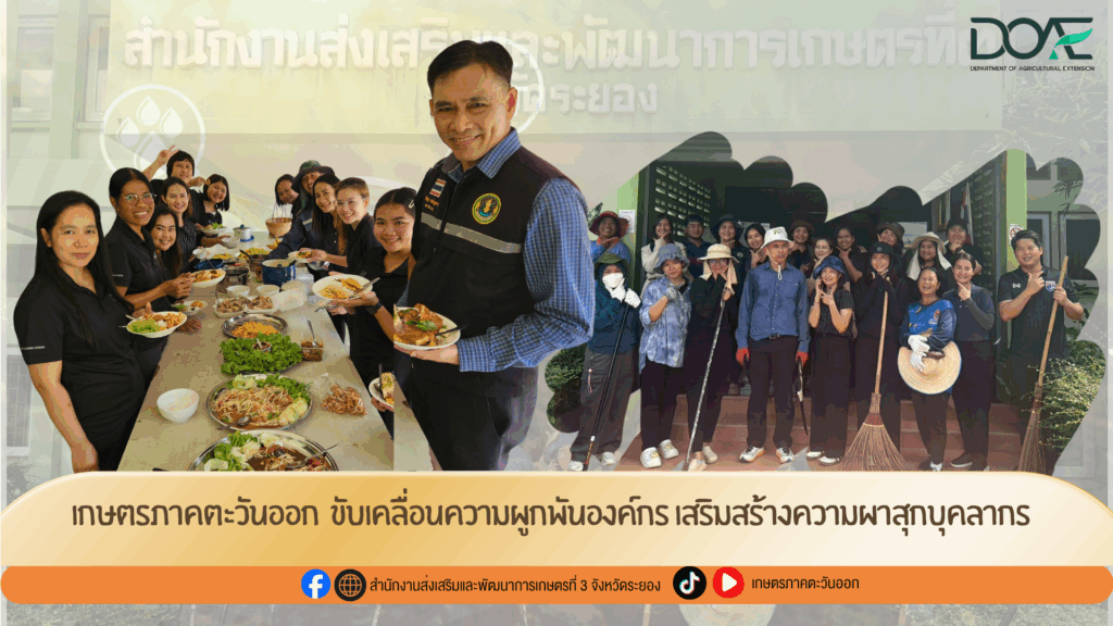 วันที่ 23 มีนาคม 2569 นายปัญญา ประดิษฐสาร ผู้อำนวยการสำนักงานส่งเสริมและพัฒนาการเกษตรที่ 3 จังหวัดระยอง พร้อมด้วยเจ้าหน้าที่ สสก.3 จังหวัดระยอง เข้าร่วมกิจกรรมขับเคลื่อนความผูกพันและความผาสุกของบุคลากรกรมส่งเสริมการเกษตร กิจกรรมดังกล่าวจัดขึ้นเพื่อเสริมสร้างความสัมพันธ์อันดีในองค์กร สร้างบรรยากาศการทำงานที่เอื้อต่อความสุข ความสามัคคี และการมีส่วนร่วมของบุคลากร โดยมุ่งเน้นการพัฒนาคุณภาพชีวิตในการทำงาน และเพิ่มประสิทธิภาพการปฏิบัติงานให้ดียิ่งขึ้น โดยบุคลากรร่วมรับประทานอาหารกลางวันร่วมกัน เพื่อสร้างความใกล้ชิดและความเป็นกันเองภายในหน่วยงาน และร่วมดำเนินกิจกรรม 5ส. เพื่อปรับปรุงสภาพแวดล้อมในการทำงานให้มีความสะอาด เป็นระเบียบ และเอื้อต่อการปฏิบัติงานอย่างมีประสิทธิภาพ พร้อมทั้งปลูกฝังวินัยและความรับผิดชอบร่วมกันในองค์กร.