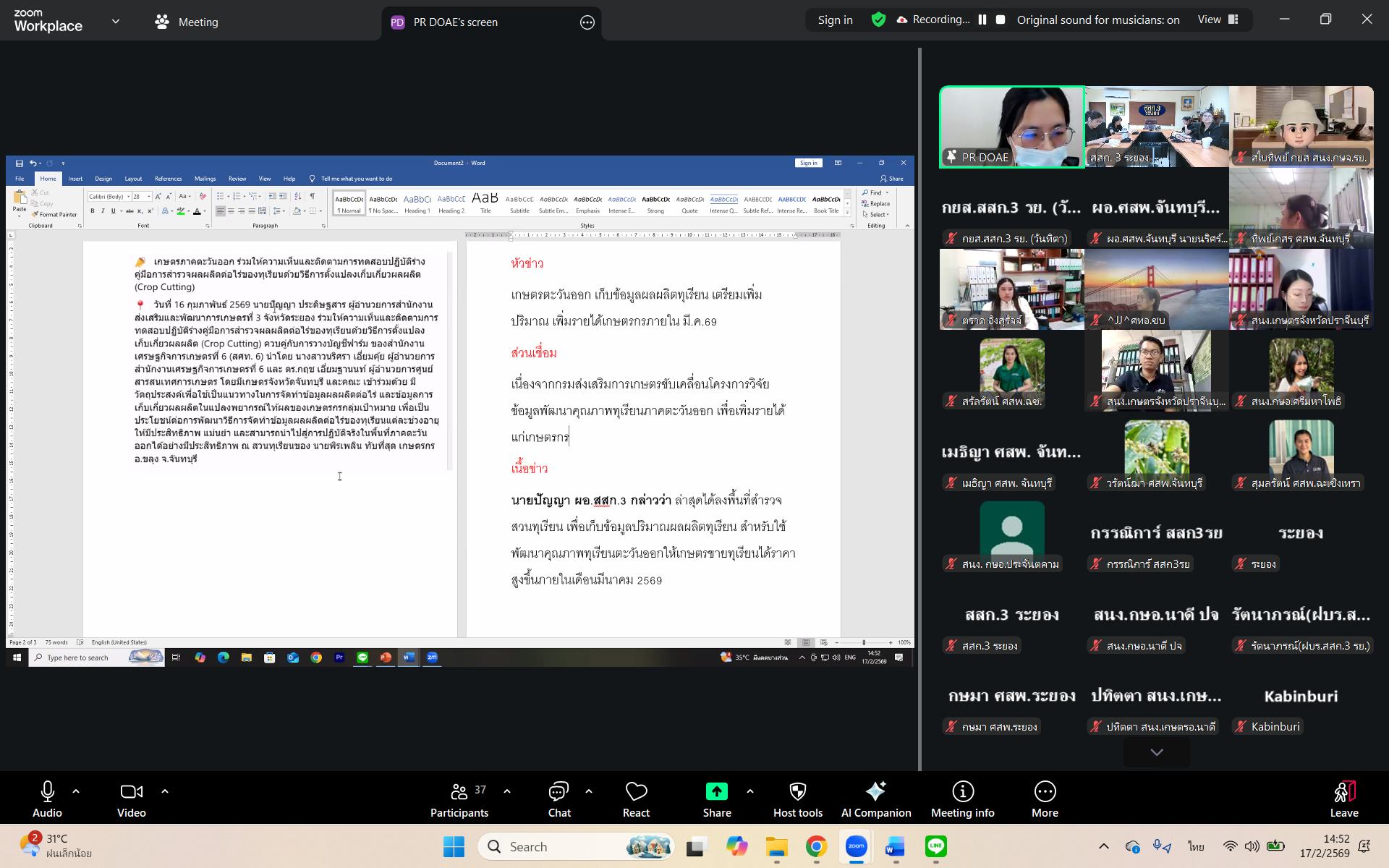 วันที่ 17 กุมภาพันธ์ 2569 กลุ่มยุทธศาสตร์และสารสนเทศ จัดกิจกรรมการจัดการความรู้ของหน่วยงาน (KM) ณ ห้องประชุมสำนักงานส่งเสริมและพัฒนาการเกษตรที่ 3 จังหวัดระยอง และผ่านระบบออนไลน์ Zoom Meeting เพื่อถ่ายทอดองค์ความรู้ให้กับบุคลากร โดย นายสุรนาท ศรีพันธ์ นักวิชาการส่งเสริมการเกษตรชำนาญการ สำนักงานเกษตรอำเภอบางเสาธง จังหวัดสมุทรปราการ เป็นวิทยากรบรรยายและฝึกปฏิบัติในหัวข้อ ความรู้ด้านการจัดทำสื่อและการเผยแพร่ประชาสัมพันธ์ผลงานส่งเสริมการเกษตร และนางสาวนาฏสรวง อินทร์แก้ว นักวิชาการเผยแพร่ชำนาญการ กลุ่มเผยแพร่และประชาสัมพันธ์ สำนักพัฒนาการถ่ายทอดเทคโนโลยี บรรยายในหัวข้อ การเขียนข่าวประชาสัมพันธ์งานส่งเสริมการเกษตร เพื่อเสริมสร้างทักษะ การเรียบเรียงข่าว การกำหนดประเด็นสำคัญ ที่น่าสนใจ ผู้เข้าร่วมกิจกรรมประกอบด้วย เจ้าหน้าที่สำนักงานส่งเสริมและพัฒนาการเกษตรที่ 3 จังหวัดระยอง เจ้าหน้าที่ศูนย์ปฏิบัติการ และเจ้าหน้าที่จากสำนักงานเกษตรจังหวัดที่สนใจ