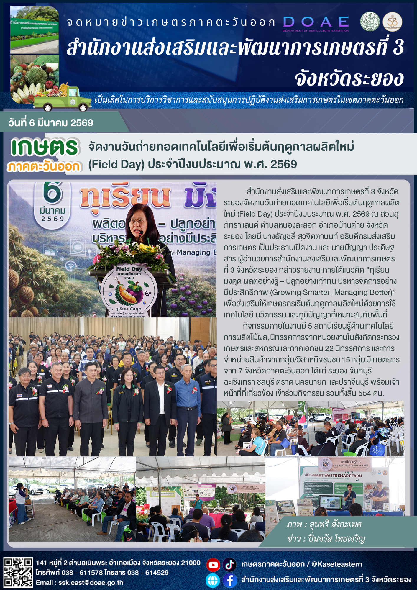 วันที่ 6 มีนาคม 2569 สำนักงานส่งเสริมและพัฒนาการเกษตรที่ 3 จังหวัดระยอง จัดงานวันถ่ายทอดเทคโนโลยีเพื่อเริ่มต้นฤดูกาลผลิตใหม่ (Field Day) ประจำปีงบประมาณ พ.ศ. 2569 ณ สวนสุภัทราแลนด์ ตำบลหนองละลอก อำเภอบ้านค่าย จังหวัดระยอง ณ สวนสุภัทราแลนด์ อำเภอบ้านค่าย จังหวัดระยอง โดยมีนางอัญชลี สุวจิตตานนท์ อธิบดีกรมส่งเสริมการเกษตร เป็นประธานในการเปิดงานฯ และ นายปัญญา ประดิษฐสาร ผู้อำนวยการสำนักงานส่งเสริมและพัฒนาการเกษตรที่ 3 จังหวัดระยอง กล่าวรายงาน