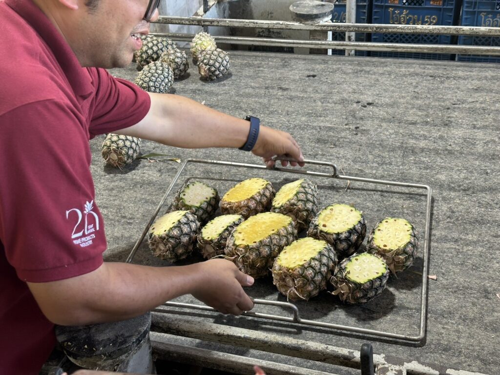 ในการติดตามสถานการณ์ครั้งนี้ พบว่าราคาสับปะรดหน้าแผงรับซื้ออยู่ที่ 5.70 บาท/กก. โดยมีการรับซื้อผลผลิตเพื่อส่งอุตสาหกรรมโรงงานเพื่อแปรรูป คั้นน้ำ และผลไม้กระป๋อง โดยสาเหตุที่ปัจจุบันราคา 5.70 บาท (ราคาใกล้เคียงกับต้นทุนการผลิต) เนื่องจากผลผลิตสับปะรดในช่วงนี้มีปริมาณผลผลิตที่ออกสู่ตลาดมาก และคาดว่ากระจุกตัวถึงช่วงวันที่ 20 ธันวาคม 2568 ซึ่งเป็นการกระจุกตัวในช่วงสั้นๆ