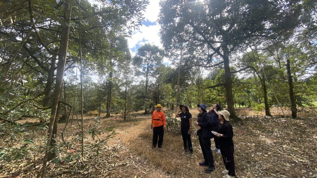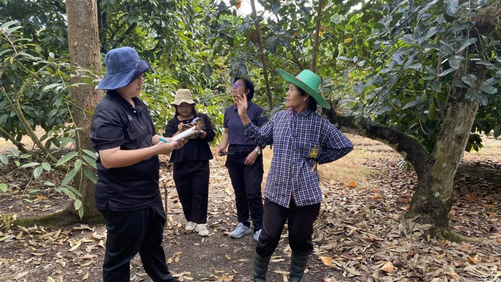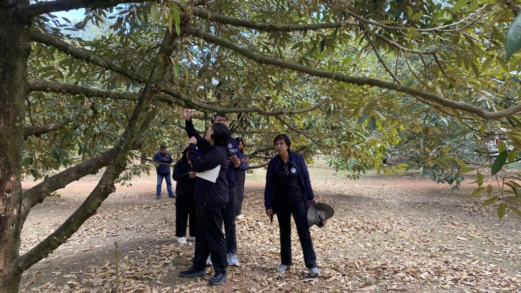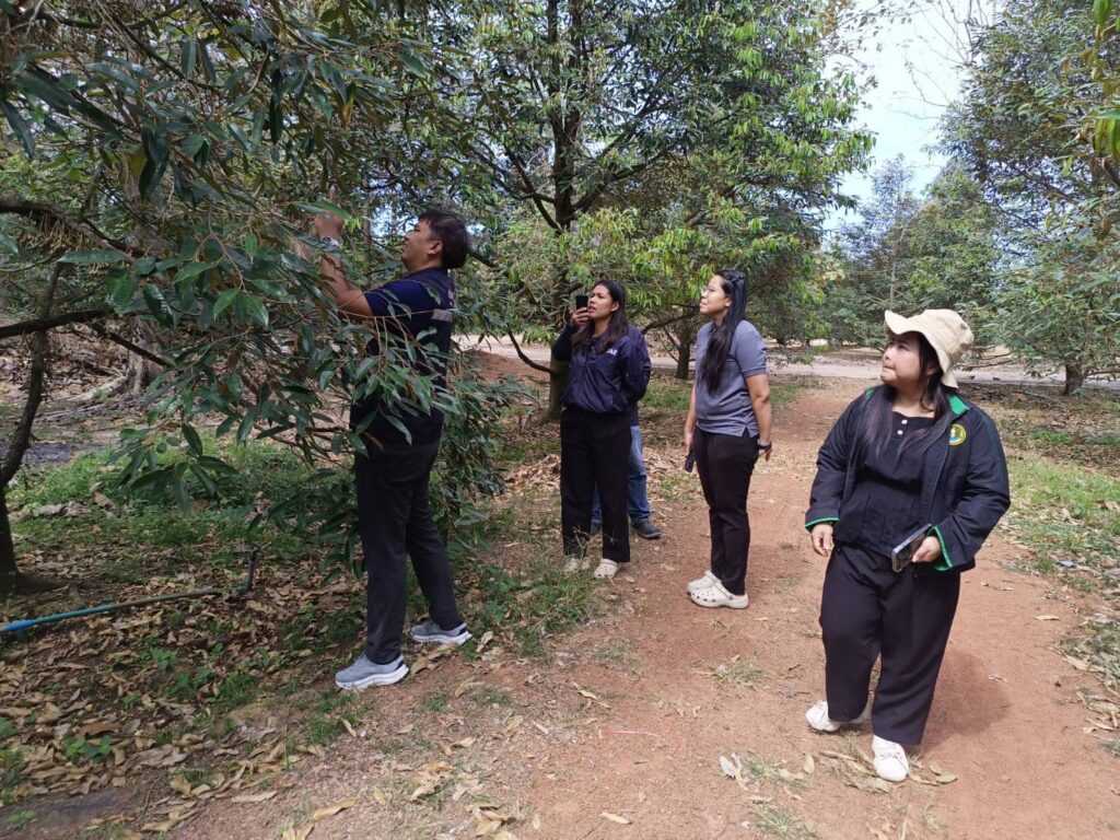 วันที่ 9 ธันวาคม 2568 นางสาวอมลรุจี เกตุสุริยงค์ นักวิชาการเกษตรชำนาญการ และนางสาวผกาพันธุ์ละมัย นักวิชาการเกษตรชำนาญการ ลงพื้นที่ประเมินสถานการณ์ผลไม้ภาคตะวันออกตามระยะการพัฒนาของดอก ณ พื้นที่ในจังหวัดระยอง โดยมี นางประทุมทิพย์ สินเปี่ยม หัวหน้ากลุ่มส่งเสริมและพัฒนาการผลิต พร้อมด้วยเจ้าหน้าที่ผู้รับผิดชอบงานไม้ผลระดับจังหวัดของสำนักงานเกษตรจังหวัดระยอง ร่วมให้ข้อมูลสถานการณ์การออกดอกของพืชทุเรียนซึ่งอยู่ในระยะเหยียดตีนหนูและระยะมะเขือพวง สำหรับมังคุดยังไม่พบการออกดอก ซึ่งการประเมินในครั้งนี้เพื่อเตรียมความพร้อมสำหรับจัดทำข้อมูลประมาณการผลผลิตไม้ผลภาคตะวันออก (ข้อมูลเอกภาพ) และจัดทำแผนบริหารจัดการผลไม้ภาคตะวันออกต่อไป