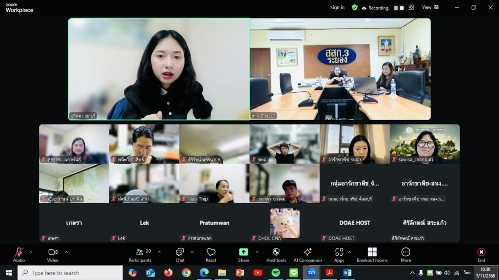 วันที่ 7 พฤศจิกายน 2568 นางอมรรัตน์ ลิมป์สุคนธ์ รักษาราชการแทนผู้อำนวยการสำนักงานส่งเสริมและพัฒนาการเกษตรที่ 3 จังหวัดระยอง ประชุมเจ้าหน้าที่อารักขาพืชภาคตะวันออก ประจำเดือนพฤศจิกายน ปีงบประมาณ พ.ศ. 2569 ณ ห้องประชุมสำนักงานส่งเสริมและพัฒนาการเกษตรที่ 3 จังหวัดระยอง และผ่านระบบออนไลน์ด้วยโปรแกรม Zoom Meeting