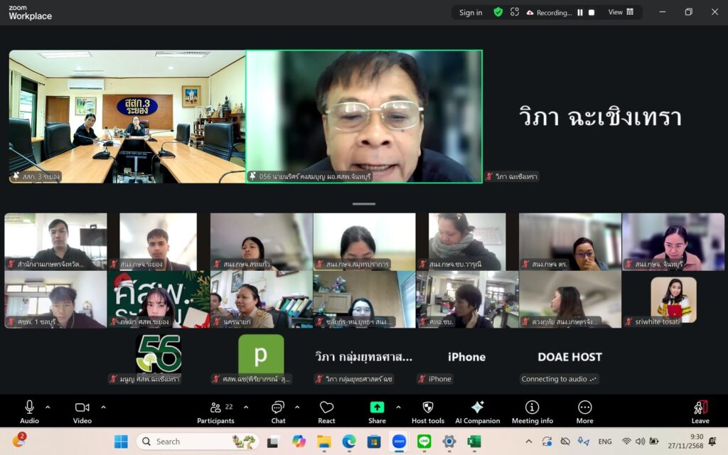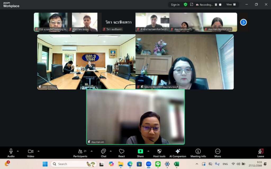 วันที่ 27 พฤศจิกายน 2568 กลุ่มยุทธศาสตร์และสารสนเทศ จัดประชุมวางแผนการจัดงานวันถ่ายทอดเทคโนโลยีเพื่อเริ่มต้นฤดูกาลผลิตใหม่ (Field Day) ประจำปีงบประมาณ พ.ศ. 2569 ผ่านระบบออนไลน์ Zoom Meeting นำโดยนางอมรรัตน์ ลิมป์สุคนธ์ รักษาราชการ การผู้อำนวยการสำนักงานส่งเสริมและพัฒนาการเกษตรที่ 3 จังหวัดระยอง ผู้อำนวยการกลุ่มยุทธศาสตร์และสารสนเทศ ผู้อำนวยการศูนย์ปฏิบัติการ 5 ศูนย์ สำนักงานเกษตรจังหวัด 9 จังหวัด และเจ้าหน้าที่ที่เกี่ยวข้อง ร่วมกันวิเคราะห์สถานการณ์การเกษตรในพื้นที่ พิจารณาคัดเลือกชนิดสินค้าเกษตรที่สำคัญ สถานการณ์การเกษตรที่สำคัญ หรือเทคโนโลยี นวัตกรรมการเกษตร เพื่อนำสินค้านั้นๆ มาวางแผน และกำหนดประเด็นการจัดงานดังกล่าว