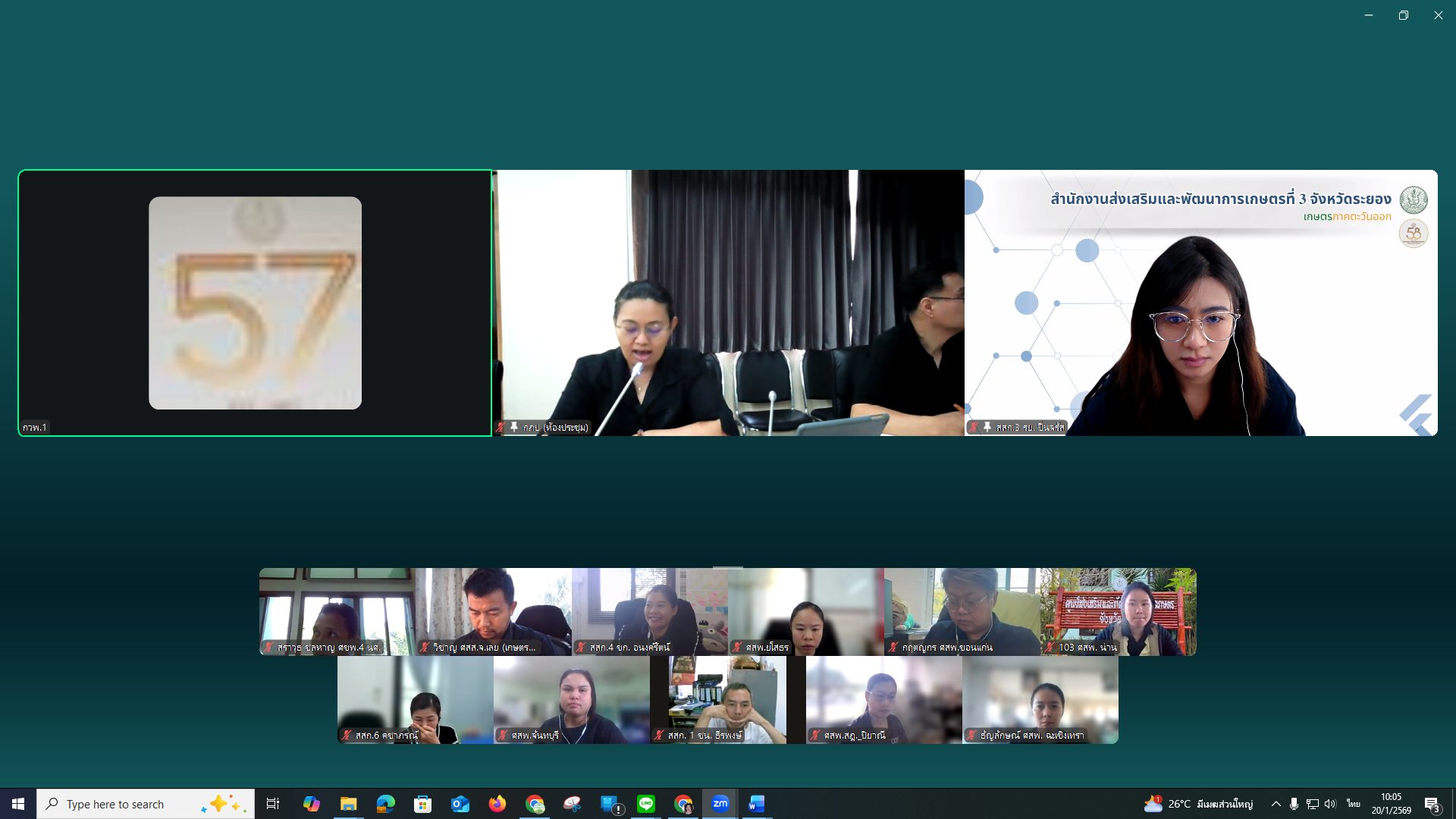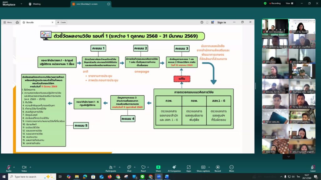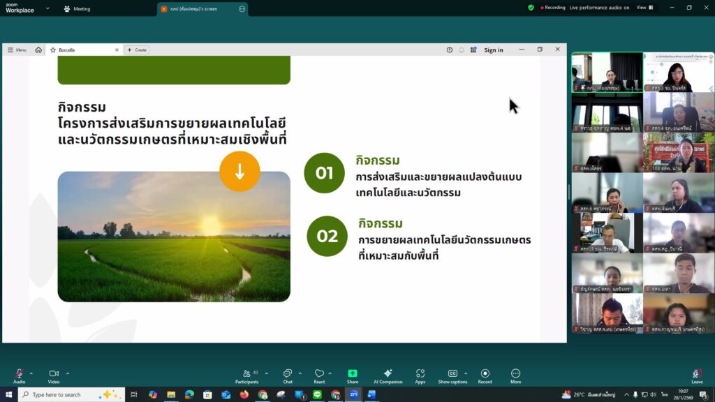 วันที่ 20 มกราคม 2569 นางสาวปิ่นจรัส ไทยเจริญ นักวิชาการส่งเสริมการเกษตรชำนาญการ กลุ่มยุทธศาสตร์และสารสนเทศ เข้าร่วมการประชุมติดตามโครงการส่งเสริมการขยายผลเทคโนโลยีและนวัตกรรมเกษตรที่เหมาะสมเชิงพื้นที่ ผ่านระบบออนไลน์ (Zoom Meeting) เพื่อรับทราบแนวทางการดำเนินงานและติดตามความก้าวหน้าการขับเคลื่อนโครงการในระดับพื้นที่ โดยมีการรายงานผลการดำเนินงานของหน่วยงานในสังกัด การติดตามความก้าวหน้าการดำเนินกิจกรรม การพัฒนาแปลงต้นแบบและจุดเรียนรู้ รวมถึงการแลกเปลี่ยนความคิดเห็นเกี่ยวกับปัญหา อุปสรรค และแนวทางแก้ไข เพื่อให้การขยายผลเทคโนโลยีและนวัตกรรมเกษตรสามารถตอบโจทย์ความต้องการของพื้นที่และเกษตรกร