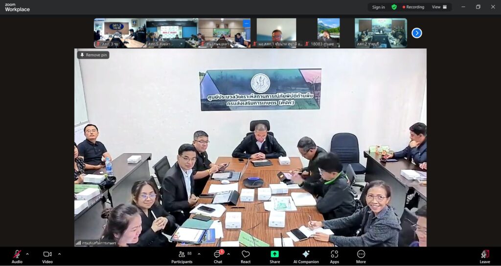 วันที่ 28 พฤศจิกายน 2568 นางอมรรัตน์ ลิมป์สุคนธ์ ผู้อำนวยการกลุ่มส่งเสริมและพัฒนาการผลิต รักษาราชการแทนผู้อำนวยการสำนักงานส่งเสริมและพัฒนาการเกษตรที่ 3 จังหวัดระยอง พร้อมด้วยนางสาวนันท์ปพร โกซิน ผู้อำนวยการกลุ่มส่งเสริมและพัฒนาเกษตรกร และเจ้าหน้าที่กลุ่มฯ เข้าร่วมการประชุมศูนย์ประมวลวิเคราะห์สถานการณ์ภัยพิบัติด้านพืช กรมส่งเสริมการเกษตร (ศปภ.) ครั้งที่ 3/2568 เพื่อรับทราบสถานการณ์และการให้ความช่วยเหลือเกษตรกรผู้ประสบภัยพิบัติด้านพืชช่วงฤดูฝน ผลการดำเนินงานให้ความช่วยเหลือผู้ประสบอุทกภัยภาคใต้ และร่วมพิจารณาแผนฟื้นฟูพื้นที่การเกษตรหลังน้ำลดจากอุทกภัยภาคใต้ โดยมีนายพีรพันธ์ คอทอง อธิบดีกรมส่งเสริมการเกษตร เป็นประธานในการประชุม ผ่านระบบ Zoom Meeting
