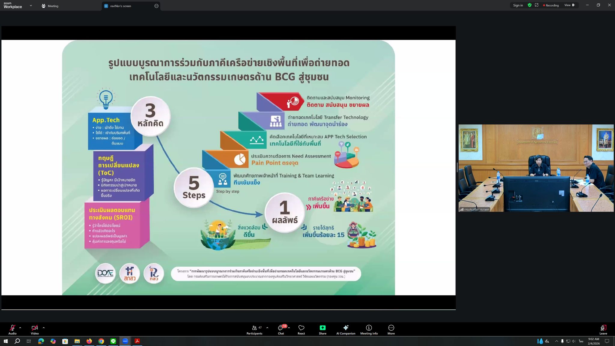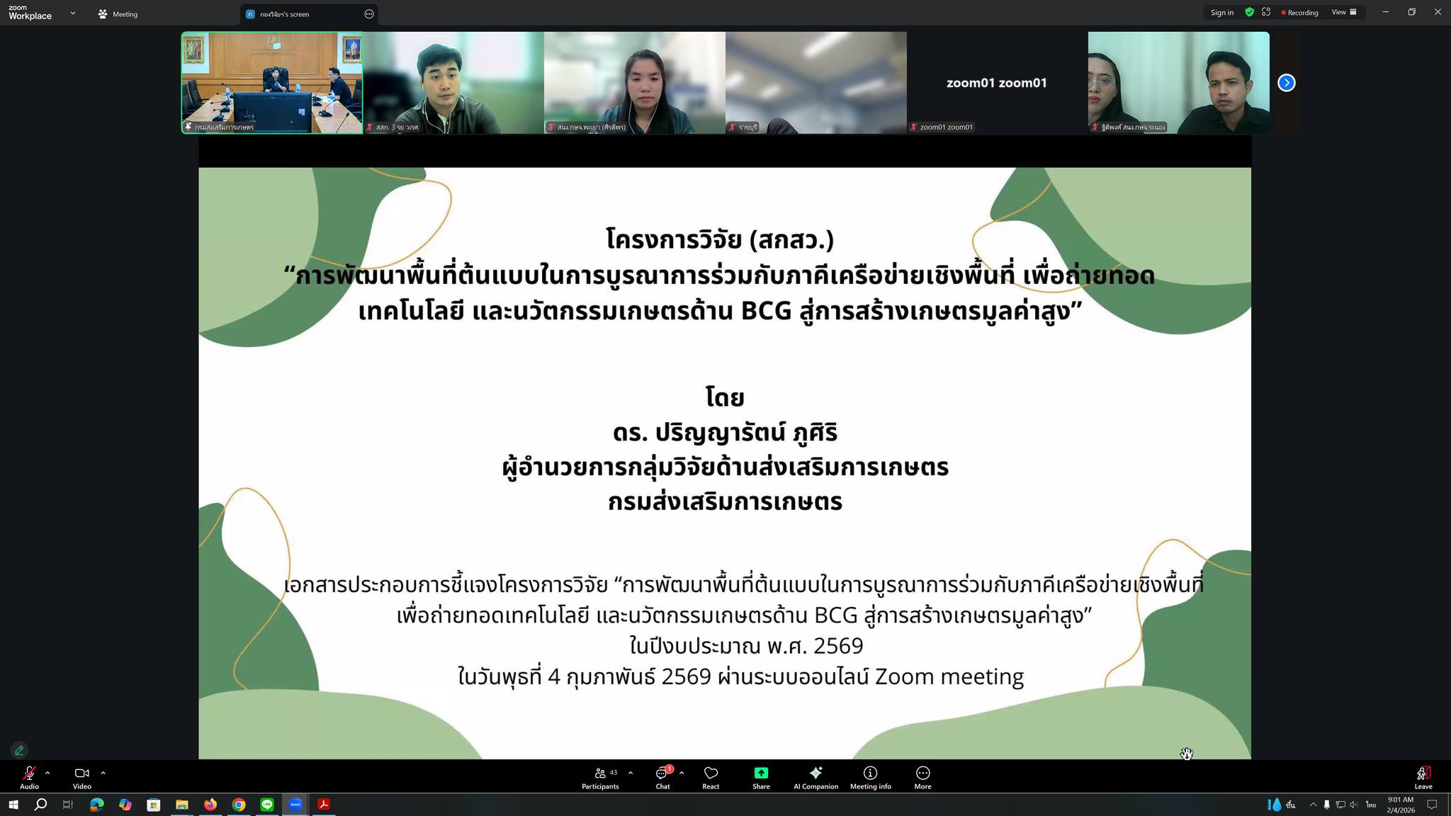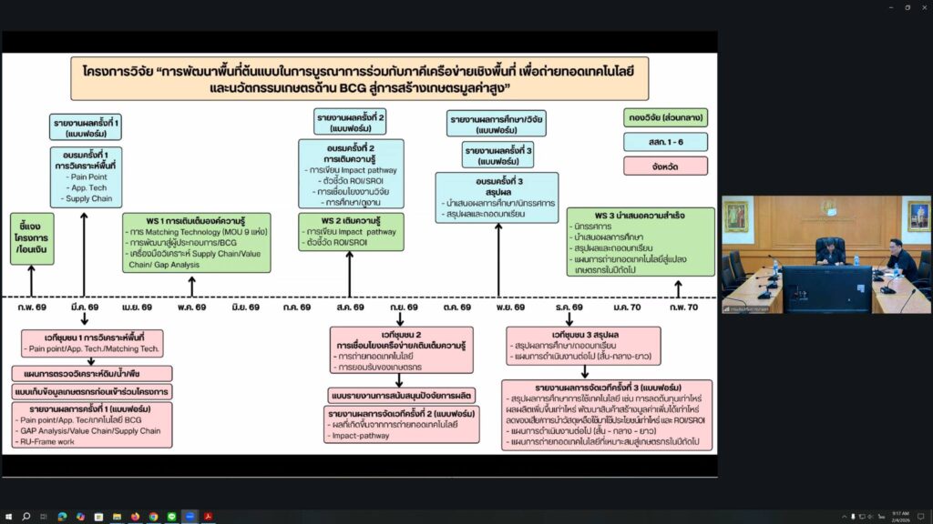 📌 วันที่ 4 กุมภาพันธ์ 2569 นางสาวอิสรี เก่งนอก ผู้อำนวยการกลุ่มยุทธศาสตร์และสารสนเทศ และนายวเรศ ศรลัมพ์ นักวิชาการส่งเสริมการเกษตรปฏิบัติการ เข้าร่วมประชุมชี้แจงแนวทางการดำเนินงานโครงการ การพัฒนาพื้นที่ต้นแบบในการบูรณาการร่วมกับภาคีเครือข่ายเชิงพื้นที่เพื่อถ่ายทอดเทคโนโลยี และนวัตกรรมเกษตรด้าน BCG สู่การสร้างเกษตรมูลค่าสูง โดยมี ดร.ปริญญารัตน์ ภูศิริ ผู้อำนวยการกลุ่มวิจัยด้านส่งเสริมการเกษตร กองวิจัยและพัฒนางานส่งเสริมการเกษตร เป็นประธาน ผ่านระบบ Zoom Meeting เพื่อรับทราบพื้นที่ดำเนินการในปี 2569 ระยะเวลาและกิจกรรมการดำเนินงาน ร่วมกับรูปแบบ 3 หลักคิด 5 ขั้นตอน 1 ผลลัพธ์ แทนเจ้าหน้าที่ผู้ร่วมวิจัยโครงการวิจัยฯ