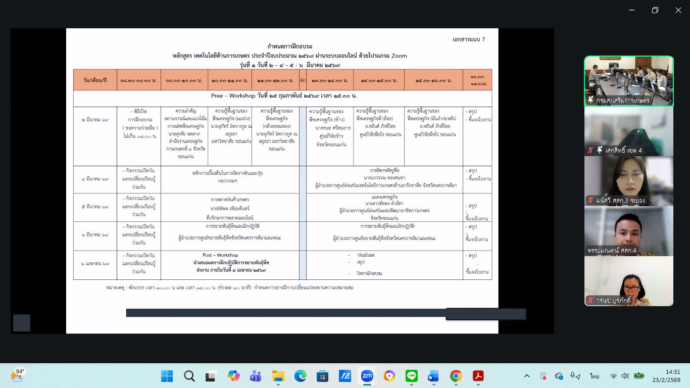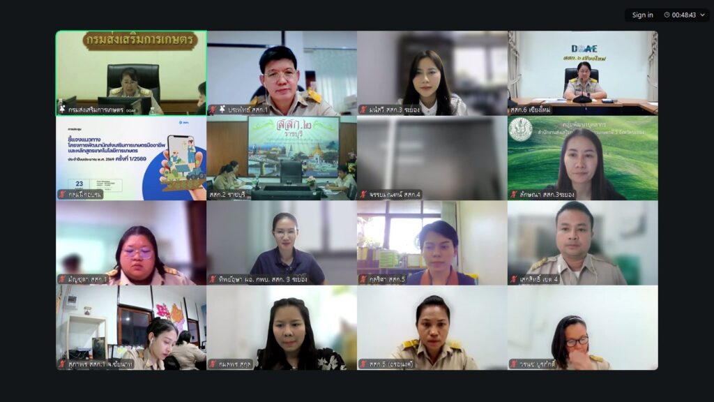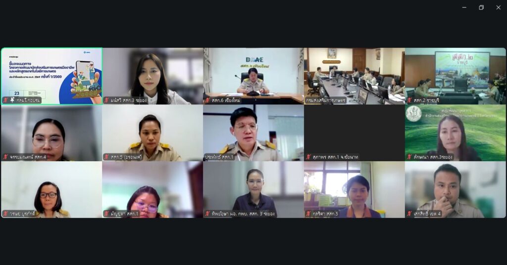 วันที่ 23 กุมภาพันธ์ 2569 กลุ่มพัฒนาบุคลากร เข้าร่วมประชุมชี้แจงแนวทางโครงการพัฒนานักส่งเสริมการเกษตรมืออาชีพ และหลักสูตรเทคโนโลยีการเกษตร ประจำปีงบประมาณ พ.ศ. 25269 โดยมีนางธัญธิตา บุญญมณีกุล รองอธิบดีกรมส่งเสริมการเกษตร เป็นประธานและร่วมกำหนดแนวทางการดำเนินงานทั้ง 2 หลักสูตร ผ่านระบบออนไลน์ (Zoom Meeting)