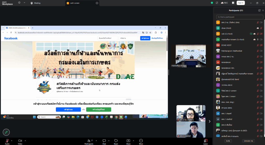 วันที่ 12 มีนาคม 2569 สำนักงานส่งเสริมและพัฒนาการเกษตรที่ 3 จังหวัดระยอง เข้าร่วมประชุมคณะอนุกรรมการการสวัสดิการด้านกีฬาและนันทนาการกรมส่งเสริมการเกษตร และประชุมคณะกรรมการฝ่ายอำนวยการและคณะทำงานดำเนินกิจกรรม DOAE Virtual Run #4 ครั้งที่ 1/2569 โดย นางสาววันทิตา วุฒิพนมศักดิ์ ตำแหน่งเจ้าหน้าที่ระบบงานคอมพิวเตอร์ กลุ่มยุทธศาสตร์และสารสนเทศ ผู้แทนผู้อำนวยการสำนักงานส่งเสริมและพัฒนาการเกษตรที่ 3 จังหวัดระยอง เข้าร่วมประชุมผ่านระบบ Zoom Meeting โดยมี นายรพีทัศน์ อุ่นจิตตพันธ์ รองอธิบดีกรมส่งเสริมการเกษตร เป็นประธานในการประชุมฯ วัตถุประสงค์เพื่อชี้แจงการจัดกิจกรรม DOAE Virtual Run #4
