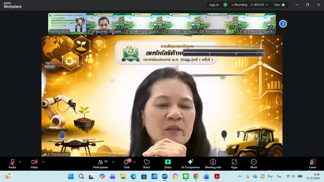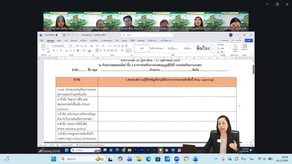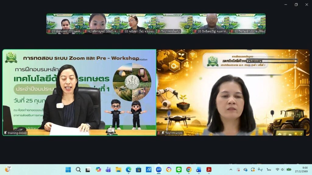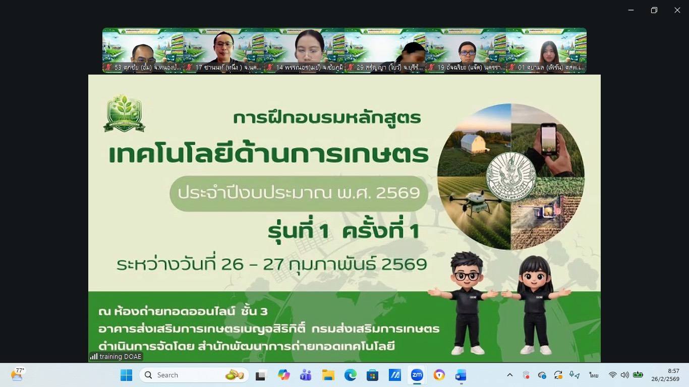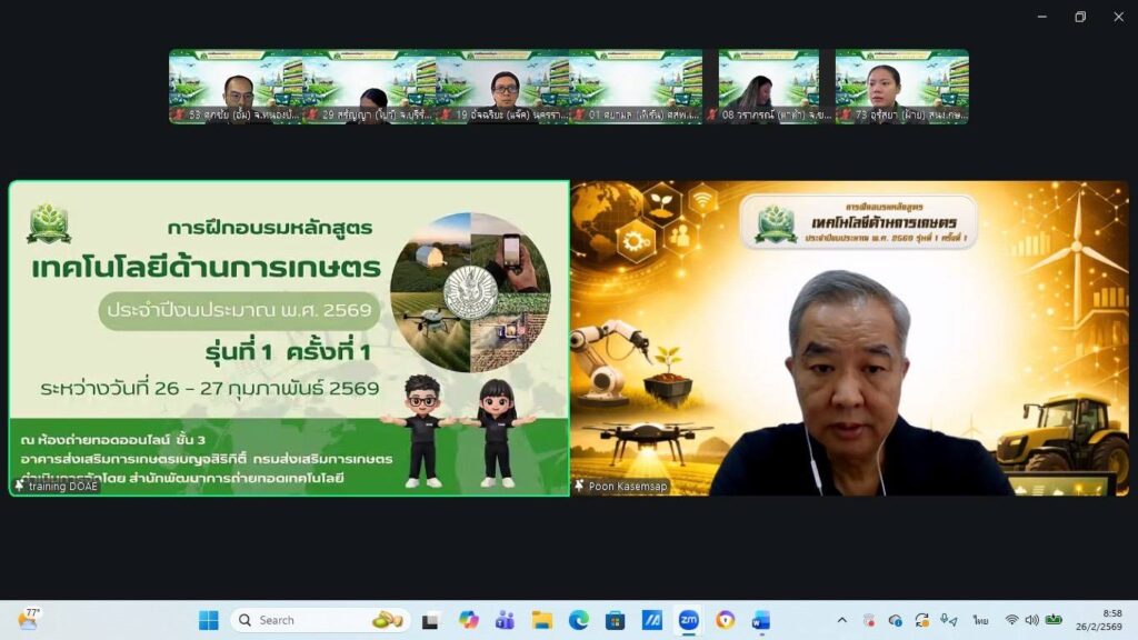📌 วันที่ 26 – 27 กุมภาพันธ์ 2569 กลุ่มพัฒนาบุคลากรดำเนินการเข้าร่วมสังเกตการณ์ในการฝึกอบรมหลักสูตรเทคโนโลยีด้านการเกษตร ประจำปีงบประมาณ พ.ศ. 2569 รุ่นที่ 1 ผ่านระบบออนไลน์ (Zoom Meeting) ซึ่งจัดโดย สำนักพัฒนาการถ่ายทอดเทคโนโลยี กรมส่งเสริมการเกษตร ให้กับผู้เข้ารับการฝึกอบรมจากสสก.ที่ 1 – 6 จำนวน 99 ราย