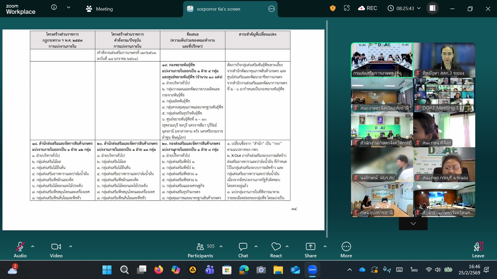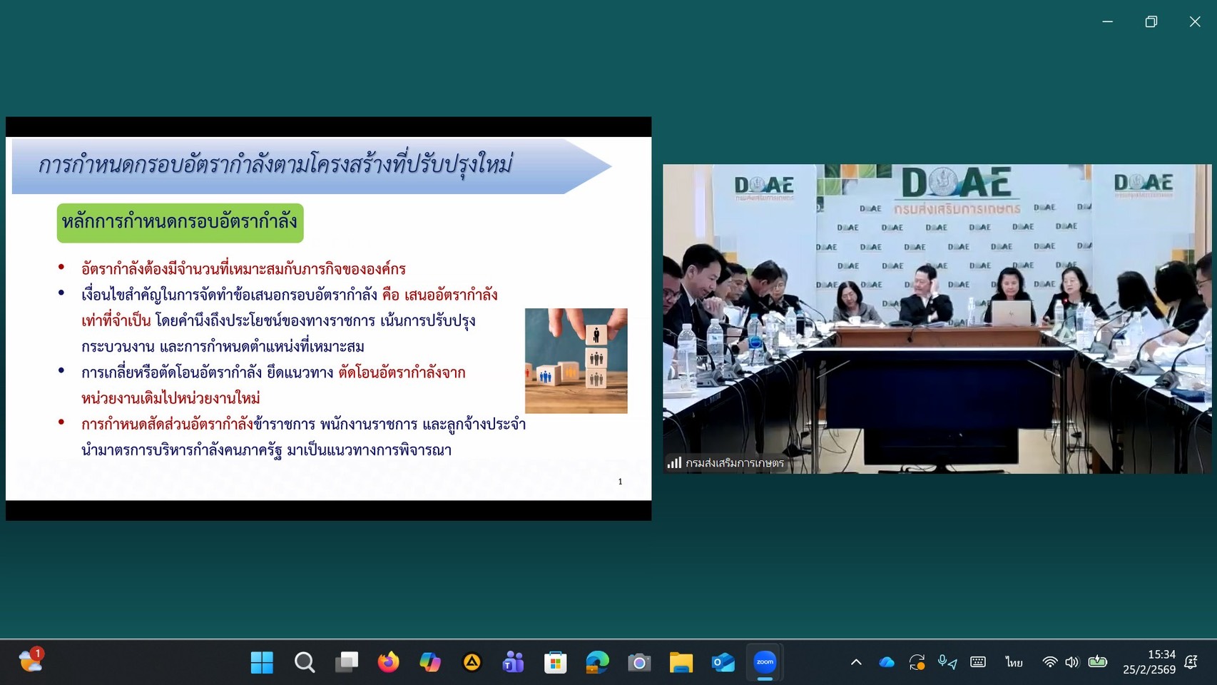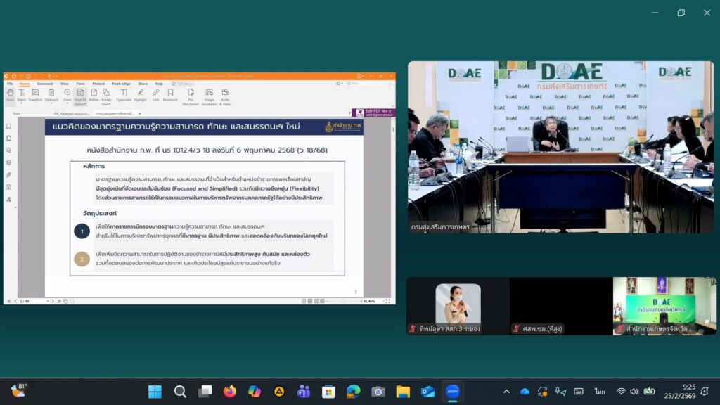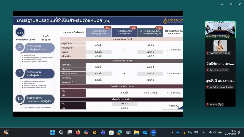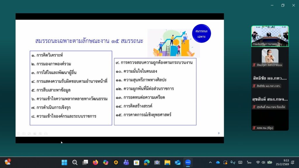 📌 วันที่ 25 กุมภาพันธ์ 2569 นางสาวทิพย์อุษา พิมนาค ผู้อำนวยการกลุ่มพัฒนาบุคลากร เข้าร่วมเวทีรับฟังความคิดเห็นเกี่ยวกับ “ร่างข้อเสนอการปรับปรุงการแบ่งส่วนราชการ การแบ่งหน่วยงานภายใน อัตรากำลังของงานส่งเสริมการเกษตร สมรรถนะเฉพาะตามลักษณะงานที่ปฏิบัติ และทักษะที่จำเป็นสำหรับการปฏิบัติงานในตำแหน่งของข้าราชการกรมส่งเสริมการเกษตร” ผ่านระบบออนไลน์ Application Zoom