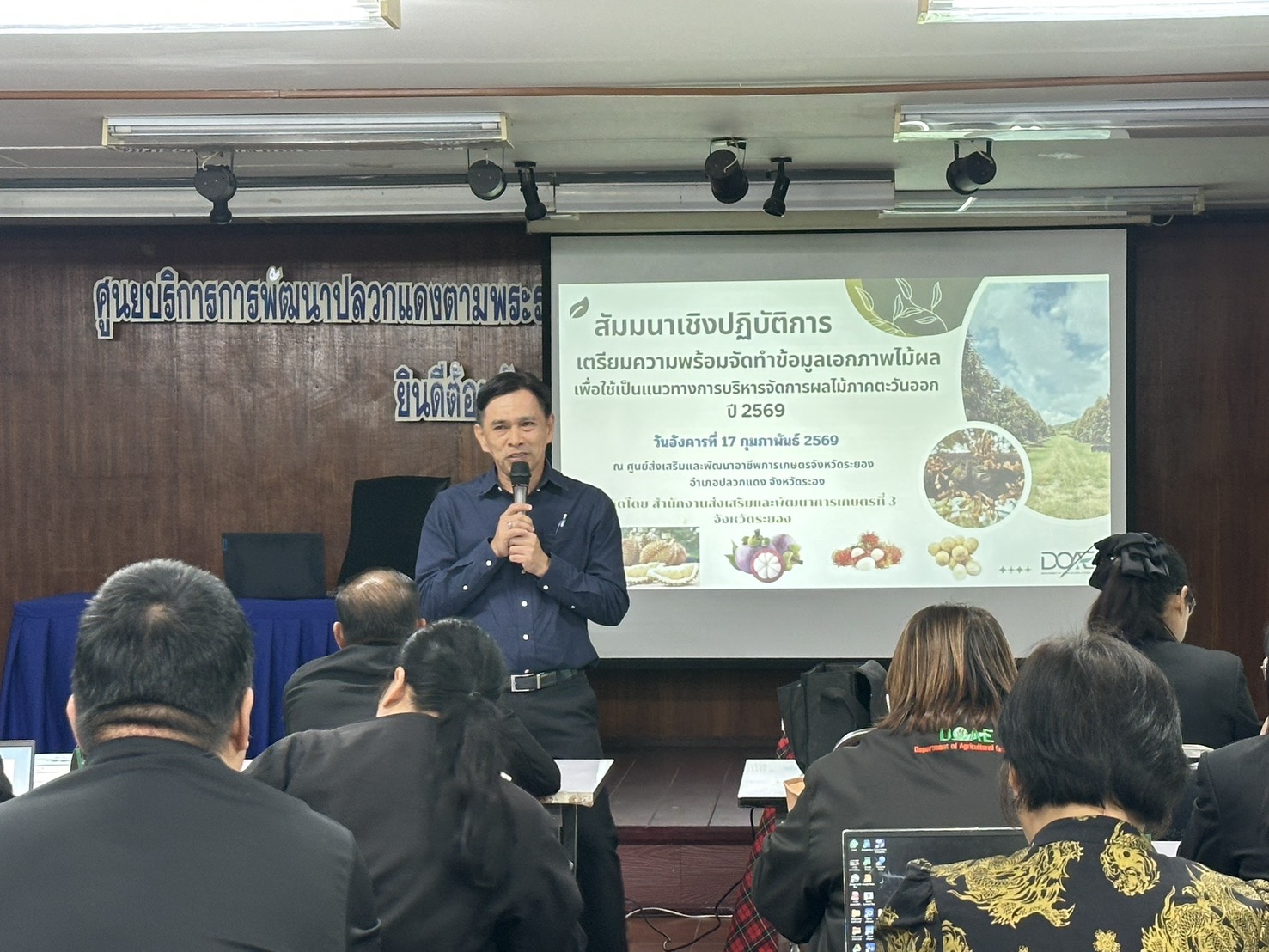📌 วันที่ 17 กุมภาพันธ์ 2569 นายปัญญา ประดิษฐสาร ผู้อำนวยการสำนักงานส่งเสริมและพัฒนาการเกษตรที่ 3 จังหวัดระยอง เป็นประธานพิธีเปิดการสัมมนาเชิงปฏิบัติการเตรียมความพร้อมจัดทำข้อมูลเอกภาพไม้ผลเพื่อใช้เป็นแนวทางการบริหารจัดการผลไม้ภาคตะวันออก ปี 2569 ณ ศูนย์ส่งเสริมและพัฒนาอาชีพการเกษตรจังหวัดระยอง อำเภอปลวกแดง จังหวัดระยอง จัดโดยกลุ่มส่งเสริมและพัฒนาการผลิต ประกอบด้วย 8 จังหวัดภาคตะวันออก มีวัตถุประสงค์เพื่อนำเสนอแลกเปลี่ยนสถานการณ์การผลิตและประมาณการผลผลิตไม้ผลภาคตะวันออก 4 ชนิด (ทุเรียน มังคุด เงาะ และลองกอง) และแลกเปลี่ยนแนวทางการเก็บข้อมูลไม้ผลโดยใช้แปลงพยากรณ์คำนวณปริมาณผลผลิตสำหรับใช้เป็นแนวทางการบริหารจัดการผลผลิตที่จะออกสู่ตลาดต่อไป บุคคลเข้าร่วมสัมมนาฯ รวมจำนวน 42 คน