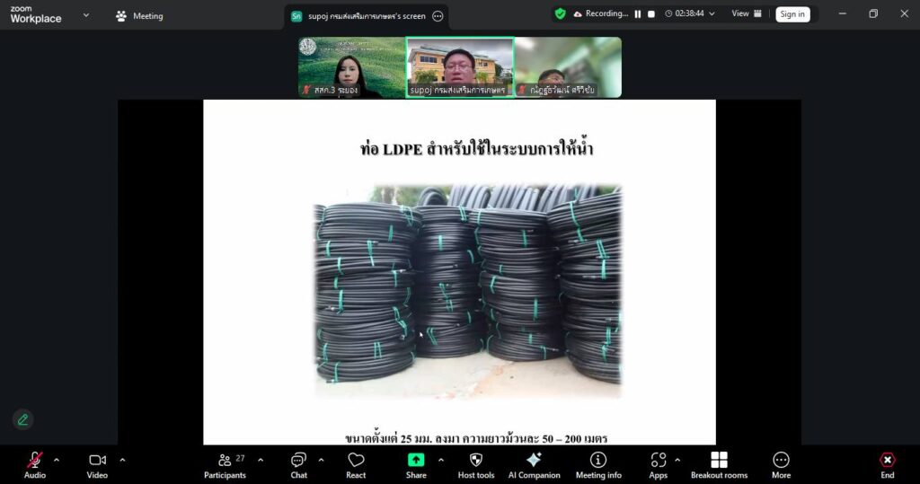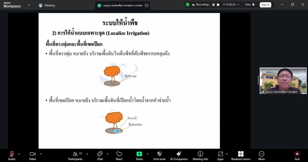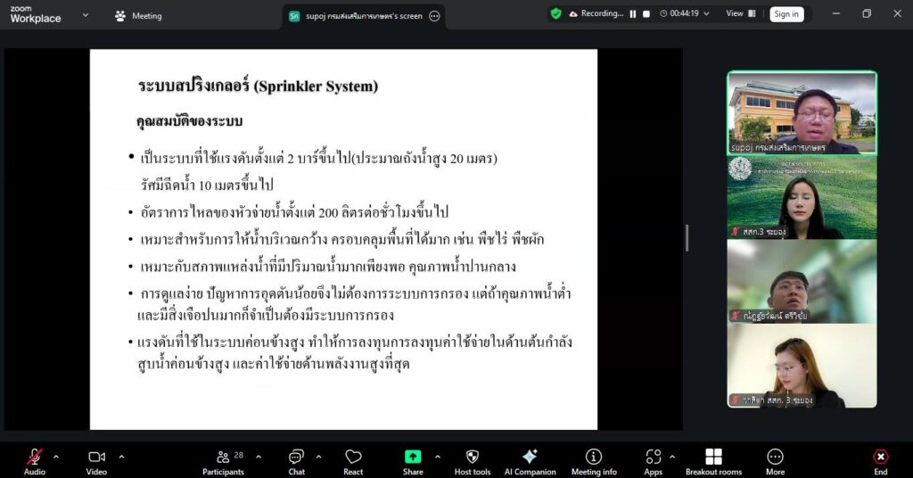 📌 วันที่ 4 – 5 มีนาคม 2569 กลุ่มพัฒนาบุคลากร ได้จัดโครงการฝึกอบรมหลักสูตร “การออกแบบระบบการให้น้ำให้เหมาะสมกับพื้นที่และผลผลิต” ผ่านระบบzoom meeting เพื่อพัฒนาความรู้ ทักษะ และศักยภาพบุคลากรด้านการจัดการน้ำในภาคการเกษตรให้สามารถนำไปประยุกต์ใช้ได้อย่างมีประสิทธิภาพและยั่งยืน โดยนายปัญญา ประดิษฐ์สาร ผู้อำนวยการสำนักงานส่งเสริมและพัฒนาการเกษตรที่ 3 จังหวัดระยอง เป็นประธานพิธีเปิดโครงการ