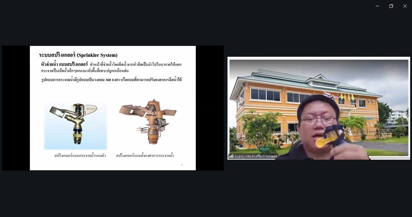 – นายเอกราช บุญล้อมรักษ์ นักวิชาการส่งเสริมการเกษตรชำนาญการ บรรยายเรื่อง “หลักการให้น้ำพืชและองค์ประกอบของระบบการให้น้ำ”