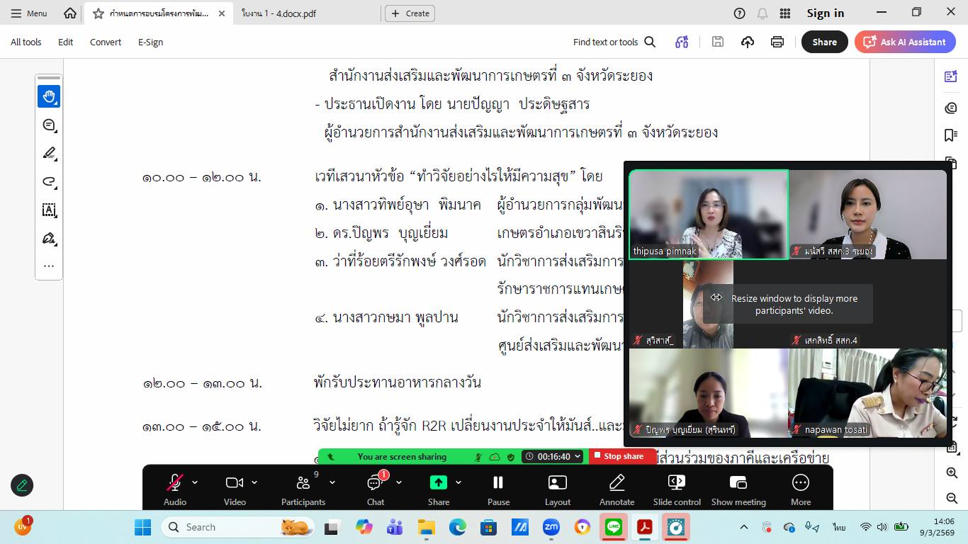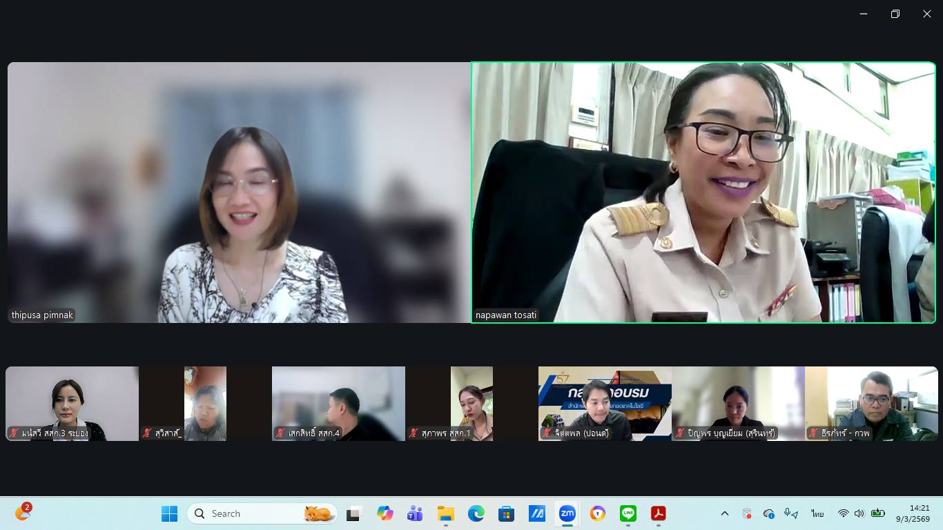 วันที่ 9 มีนาคม 2569 เวลา 14.00 – 15.00 น. กลุ่มพัฒนาบุคลากร สำนักงานส่งเสริมและพัฒนาการเกษตรที่ 3 จังหวัดระยอง ดำเนินการจัดประชุมเตรียมความพร้อมการจัด หลักสูตรการพัฒนางานส่งเสริมการเกษตรด้วยวิธีการวิจัย ระดับที่ 1 ผ่านระบบออนไลน์ (Zoom Meeting) โดยมีทีมวิทยากรและผู้จัดเข้าร่วมประชุม จำนวน 10 คน การประชุมครั้งนี้มีวัตถุประสงค์เพื่อ ชี้แจงแนวทางการดำเนินกิจกรรมตามกำหนดการจัดเวทีฝึกอบรมในวันที่ 11 มีนาคม 2569 รวมถึงการจัดกระบวนการเรียนรู้ตามแผนกิจกรรม ตลอดจนการสร้างความเข้าใจในภาพรวมของหลักสูตร เพื่อให้ทีมวิทยากรและผู้จัดมีความเข้าใจในบทบาทหน้าที่ และแนวทางการดำเนินงานร่วมกันอย่างชัดเจน ทั้งนี้ ในที่ประชุมได้มีการ มอบหมายบทบาทหน้าที่ให้กับทีมงานผู้จัดในแต่ละกระบวนการ เพื่อเตรียมความพร้อมในการดำเนินเวทีฝึกอบรมให้เป็นไปอย่างมีประสิทธิภาพ และเป็นไปในทิศทางเดียวกัน