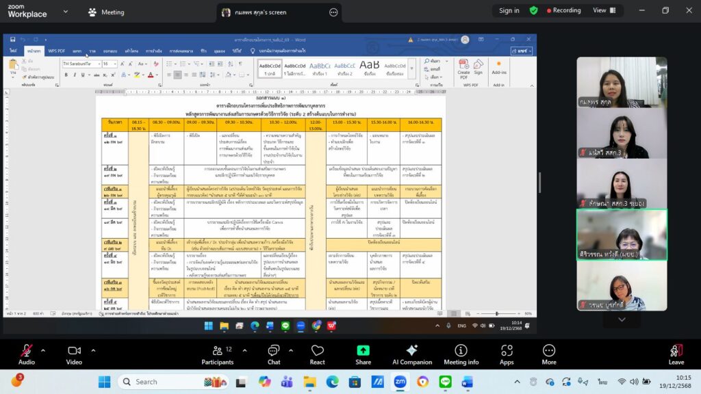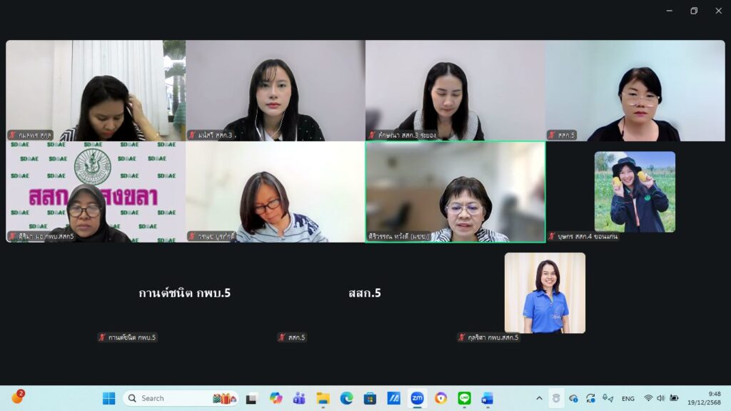 วันที่ 19 ธันวาคม 2568 กลุ่มพัฒนาบุคลากรเข้าร่วมการประชุมทีมงาน ประจำปี 2569 ครั้งที่ 2 เรื่องการออกแบบและวางแผนดำเนินงานพัฒนาบุคลากรหลักสูตรการพัฒนางานส่งเสริมการเกษตรด้วยวิธีการวิจัย ประจำปี 2569 รุ่นที่ 5 ผ่านระบบ Zoom Meeting ผู้เข้าร่วมจำนวน 12 ราย