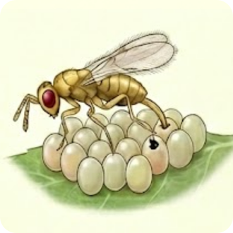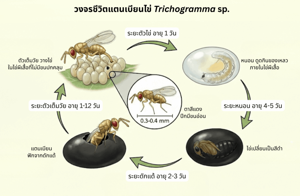 ตัวเมียจะใช้อวัยวะวางไข่ (ovipositor) แทงทะลุผนังไข่ของแมลงศัตรู แล้ววางไข่ของตนไว้ภายใน โดยสามารถวางไข่ได้ เฉลี่ย 1–4 ฟอง ต่อไข่แมลงศัตรูพืช 1 ฟอง ขึ้นอยู่กับขนาดของไข่แมลงศัตรูพืช